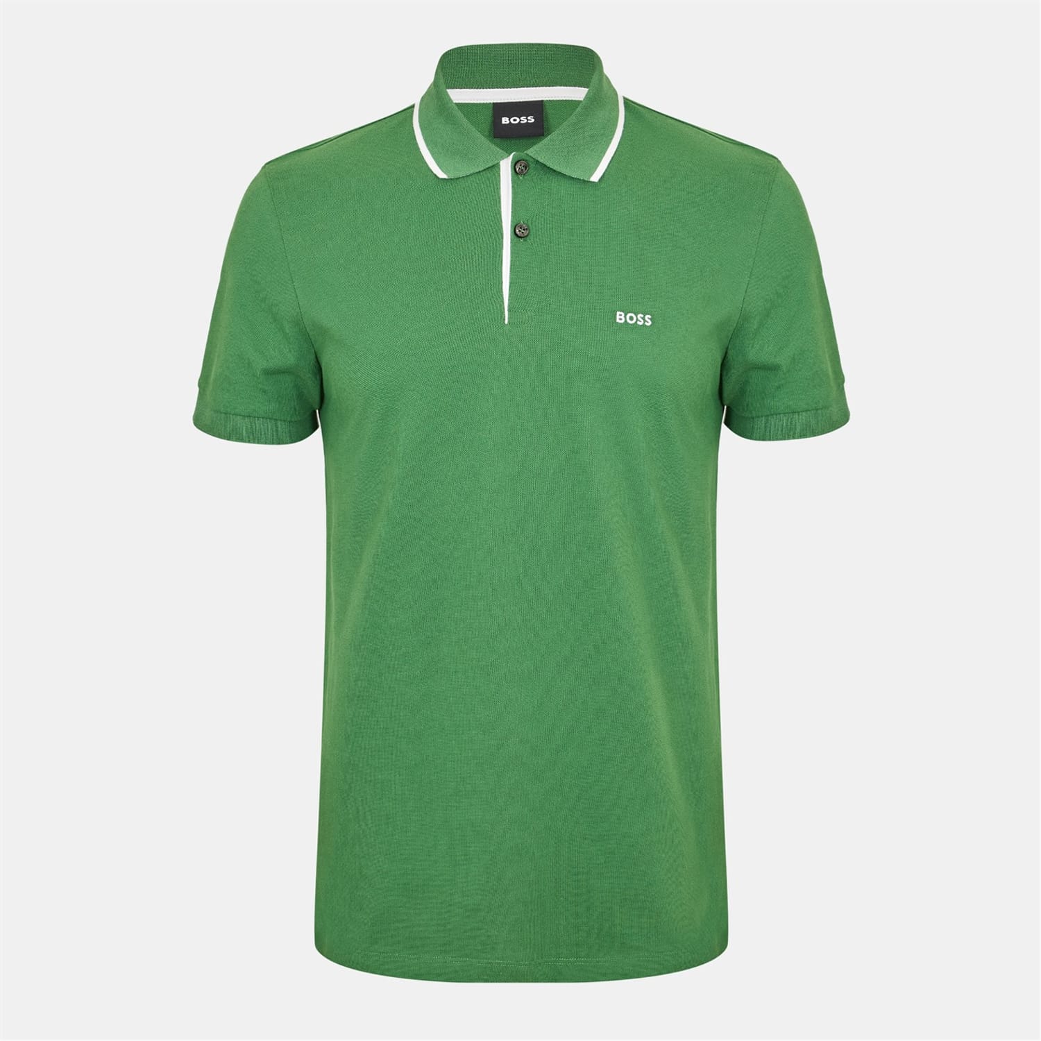 This Boss top features a classic polo collar and a front button closure, offering a regular fit. The short sleeves are complemented by ribbed cuffs, while a chest logo adds a touch of brand identity. The solid pattern ensures a timeless look, making it a versatile addition to any wardrobe. -