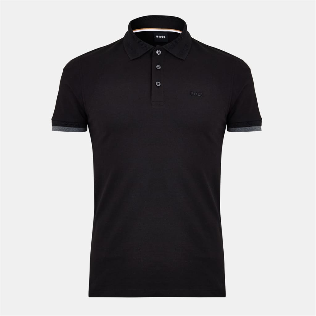 This Boss top features a classic polo collar and a front button closure, offering a regular fit. The short sleeves are complemented by ribbed cuffs, while the solid pattern adds a timeless touch. An embroidered logo and button placket embellish the design, making it a versatile addition to any wardrobe. -
