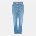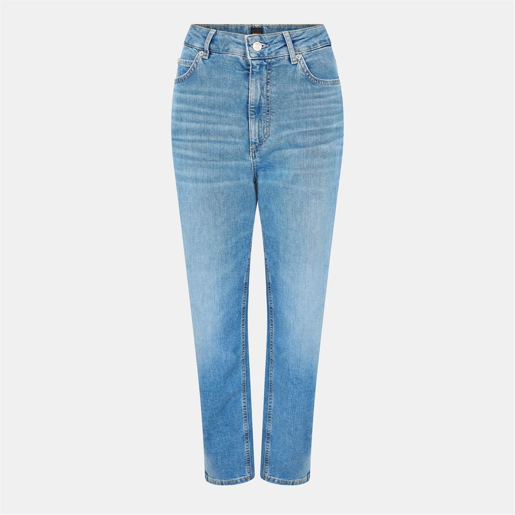 Boss jeans feature a slim fit with a classic five-pocket design. The wash pattern adds a stylish touch, while the zip fly, front button, and belt loops ensure a secure fit. Embellishments include front, back, and coin pockets, along with stitching, rivets, and a waist patch for added detail. -