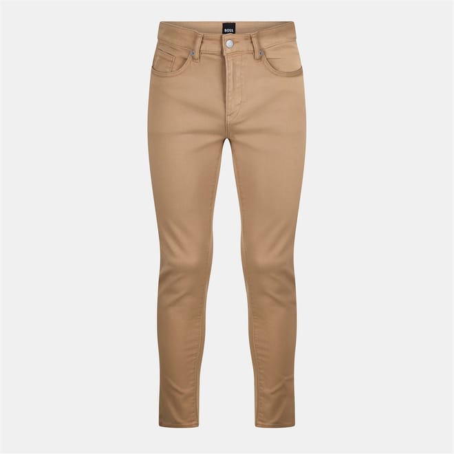 Boss jeans feature a slim fit with a classic five-pocket design. The jeans are equipped with a zip fly, front button, and belt loops for a secure fit. Embellished with rivets, stitching, and a waist patch, they include front, back, and coin pockets for practicality. -