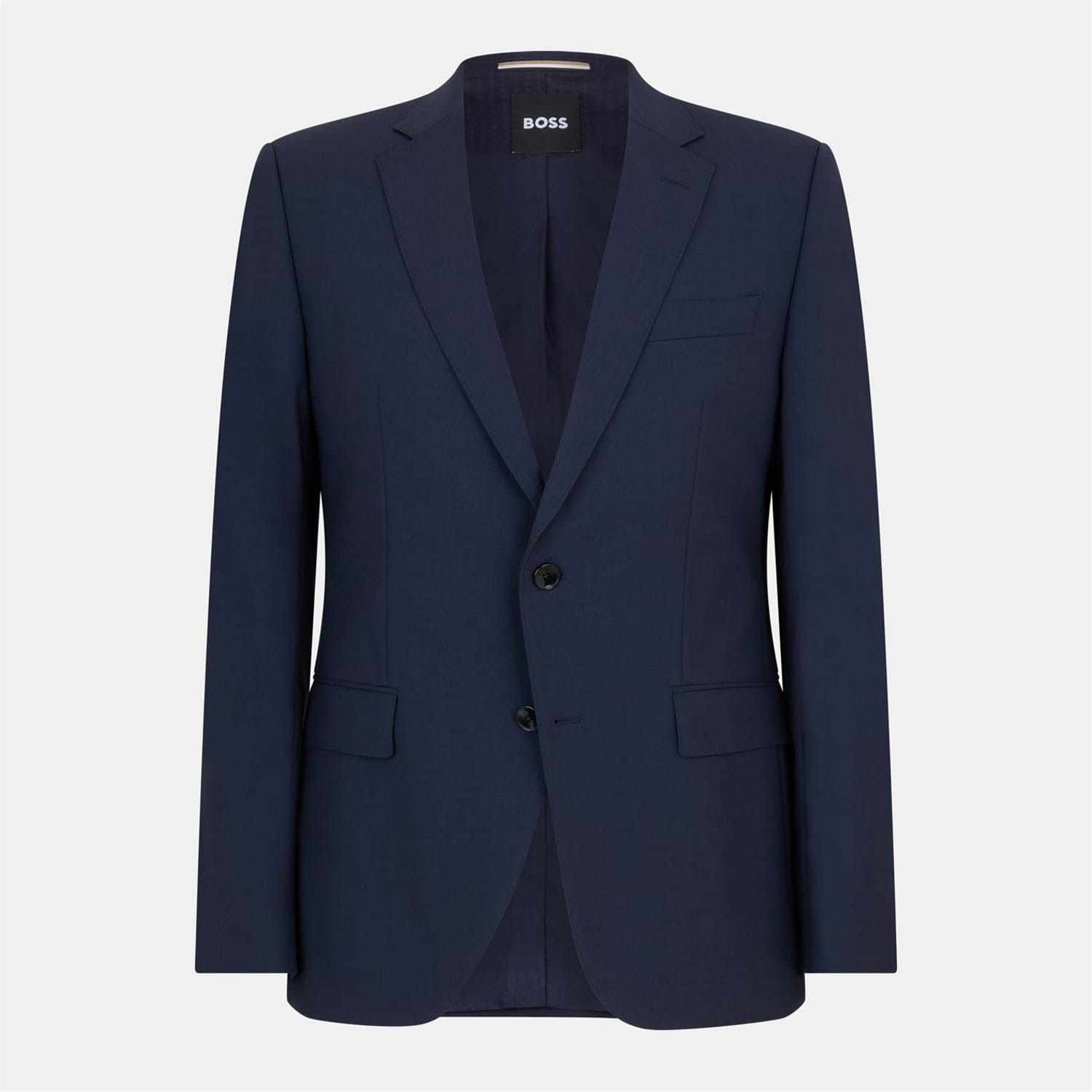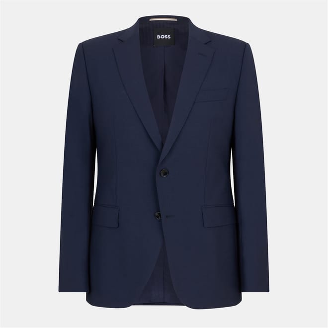 This Boss suit jacket is a formal piece featuring a lapel collar and a straight hem. It has a regular fit and a solid pattern, offering a classic look. The jacket is designed with a button closure and includes practical embellishments such as flap and chest pockets, making it both stylish and functional. -
