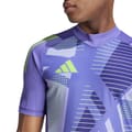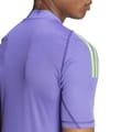 This adidas top features a geometric pattern and a slim fit, perfect for a modern look. The short sleeves and fitted cuffs add a touch of style, while the band collar enhances its unique design. Ideal for those seeking a contemporary addition to their wardrobe. -