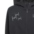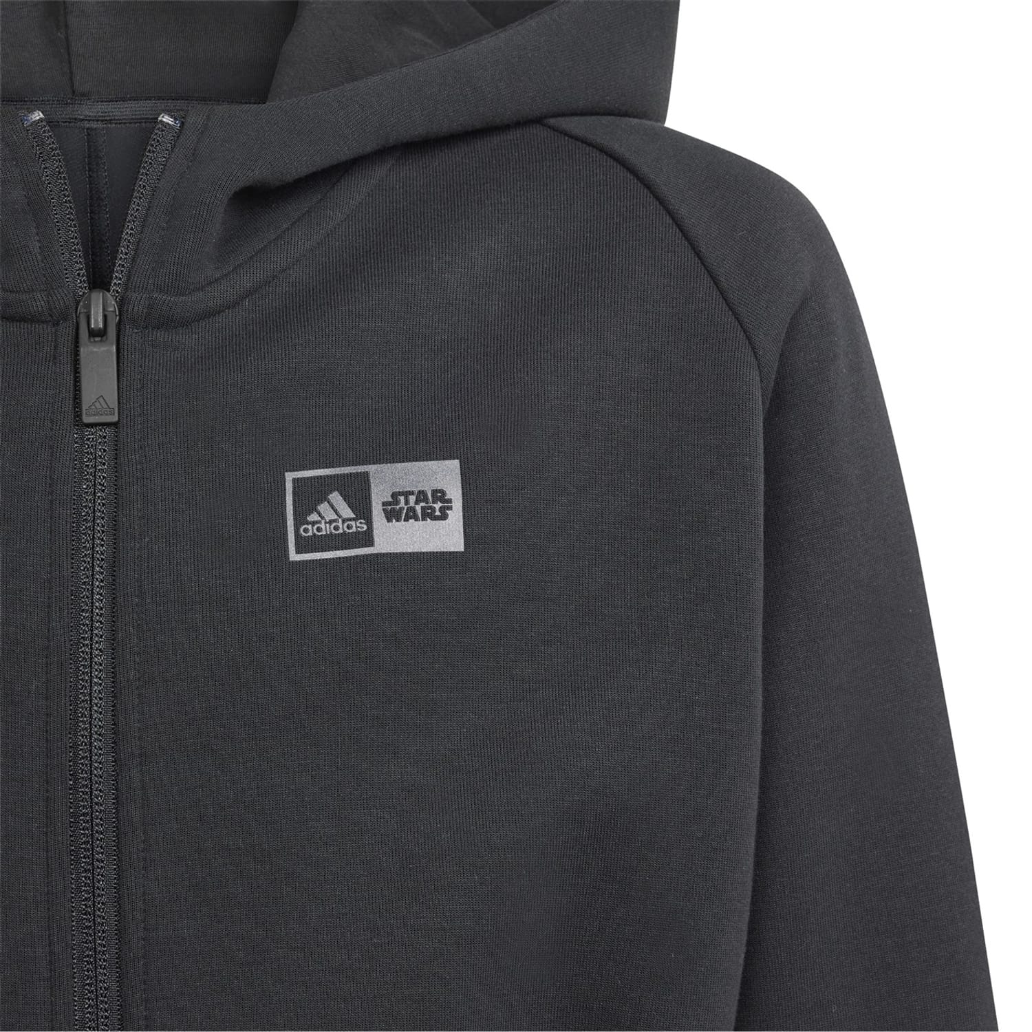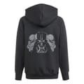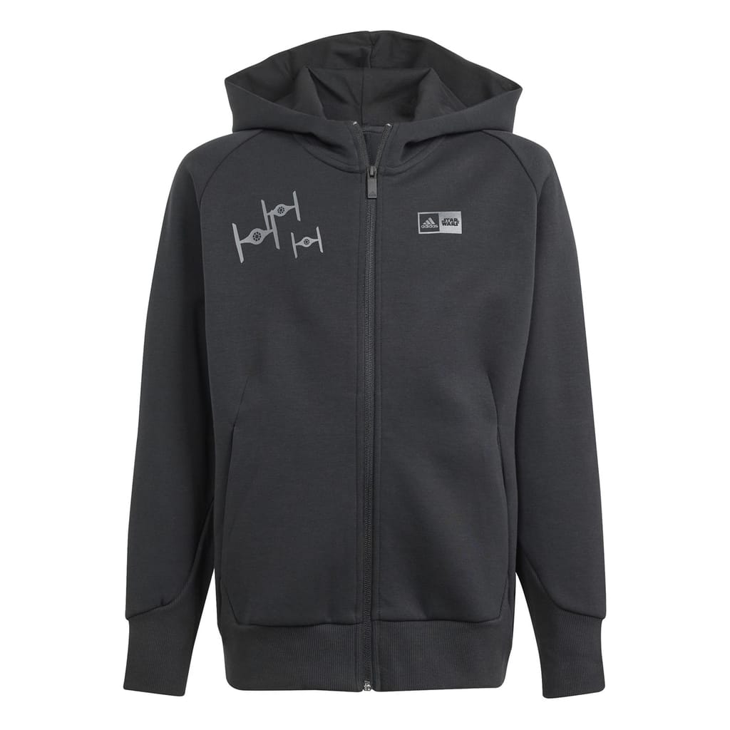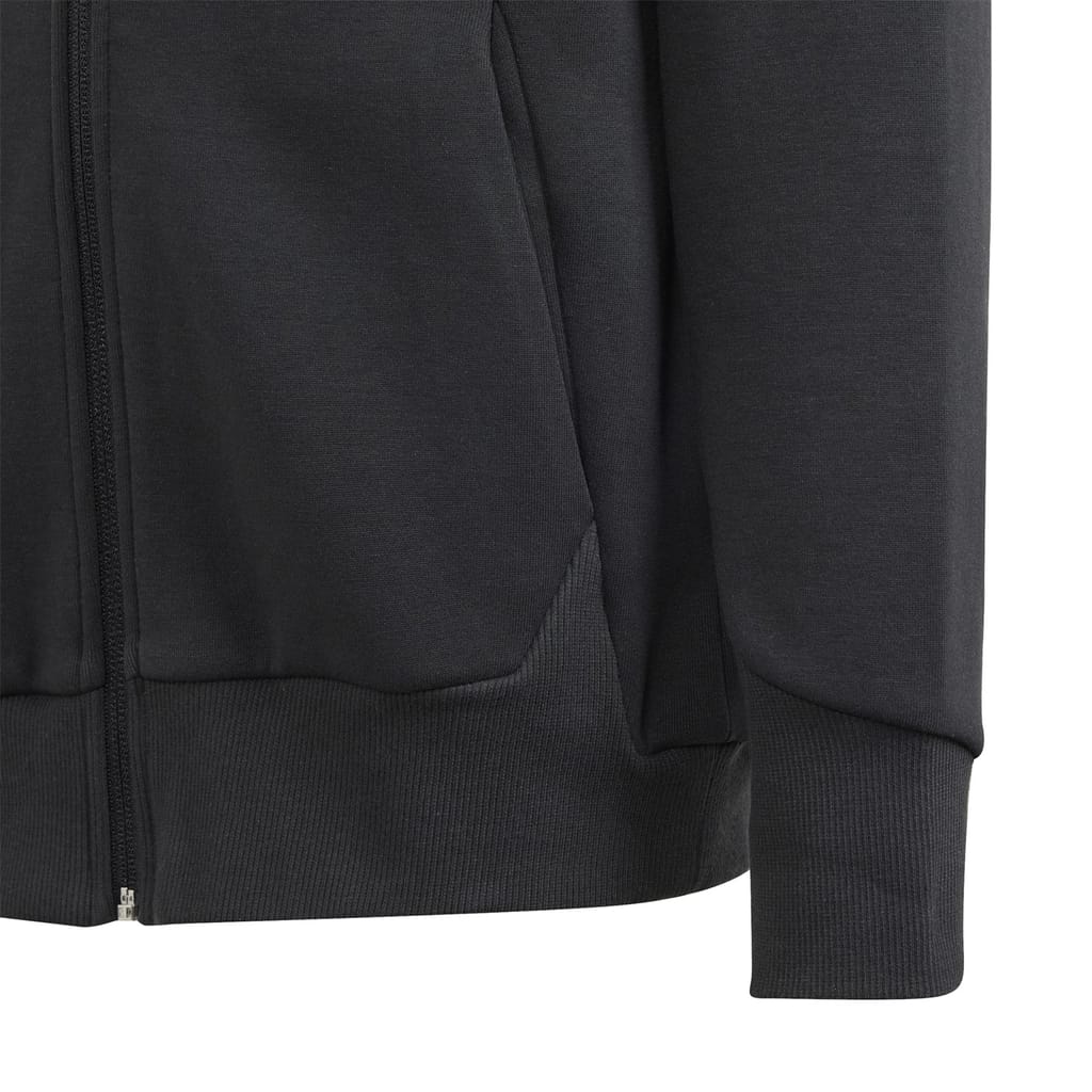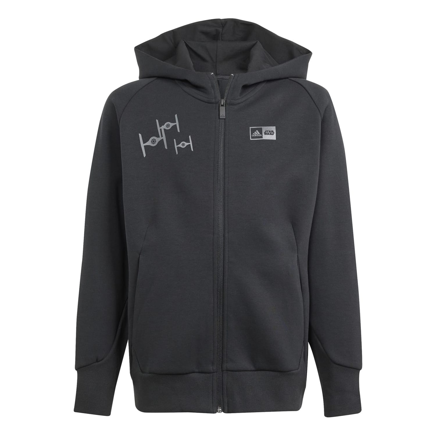 This adidas sweatshirt jacket features a hooded neckline and a full zipper closure for easy wear. The raglan sleeves and ribbed cuffs provide a comfortable fit, while the ribbed hem adds a touch of style. The jacket is adorned with a graphic print and a logo, complemented by practical front zipper pockets. Its regular fit ensures a relaxed and casual look. -