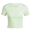 This adidas cropped top is designed for a slim fit, featuring a crew neck and short sleeves. It showcases the iconic three-bar logo and side stripes, complemented by the classic three-stripes pattern. Perfect for a stylish and sporty look. -