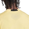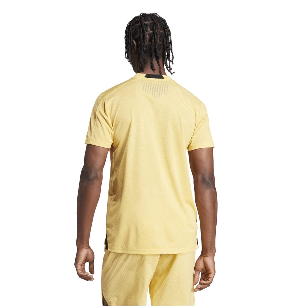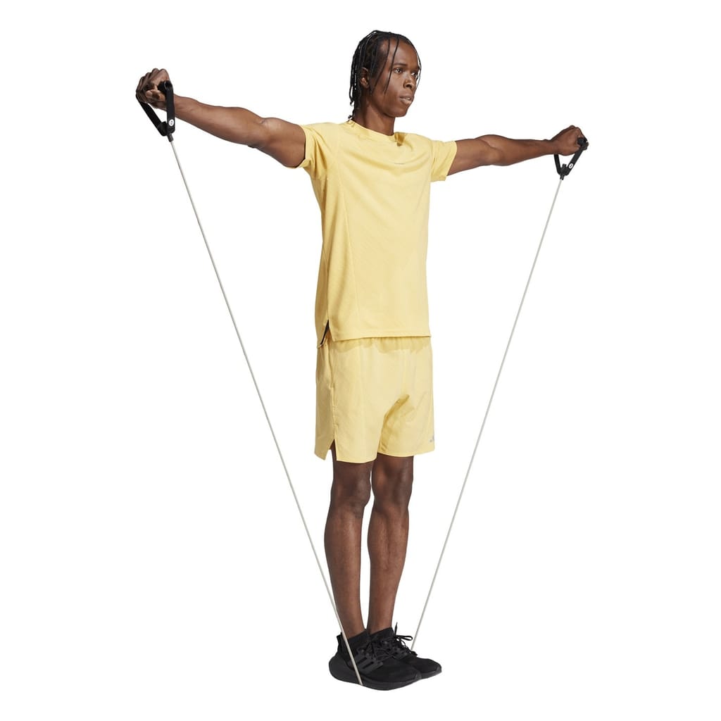 This adidas top is designed for activewear and gym enthusiasts. Featuring a crew neck and short sleeves, it offers a regular fit for comfort during workouts. The textured pattern adds a stylish touch, while the ribbed collar ensures durability. A logo embellishment completes the look, making it a perfect choice for summer activities. -