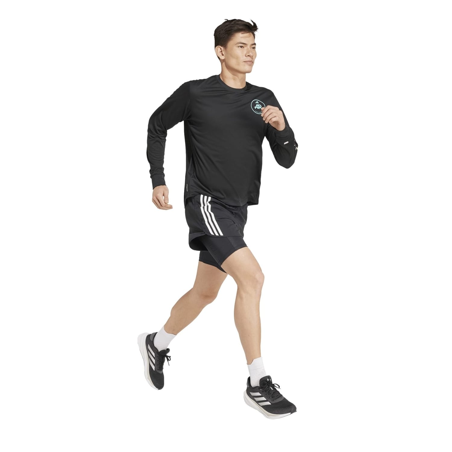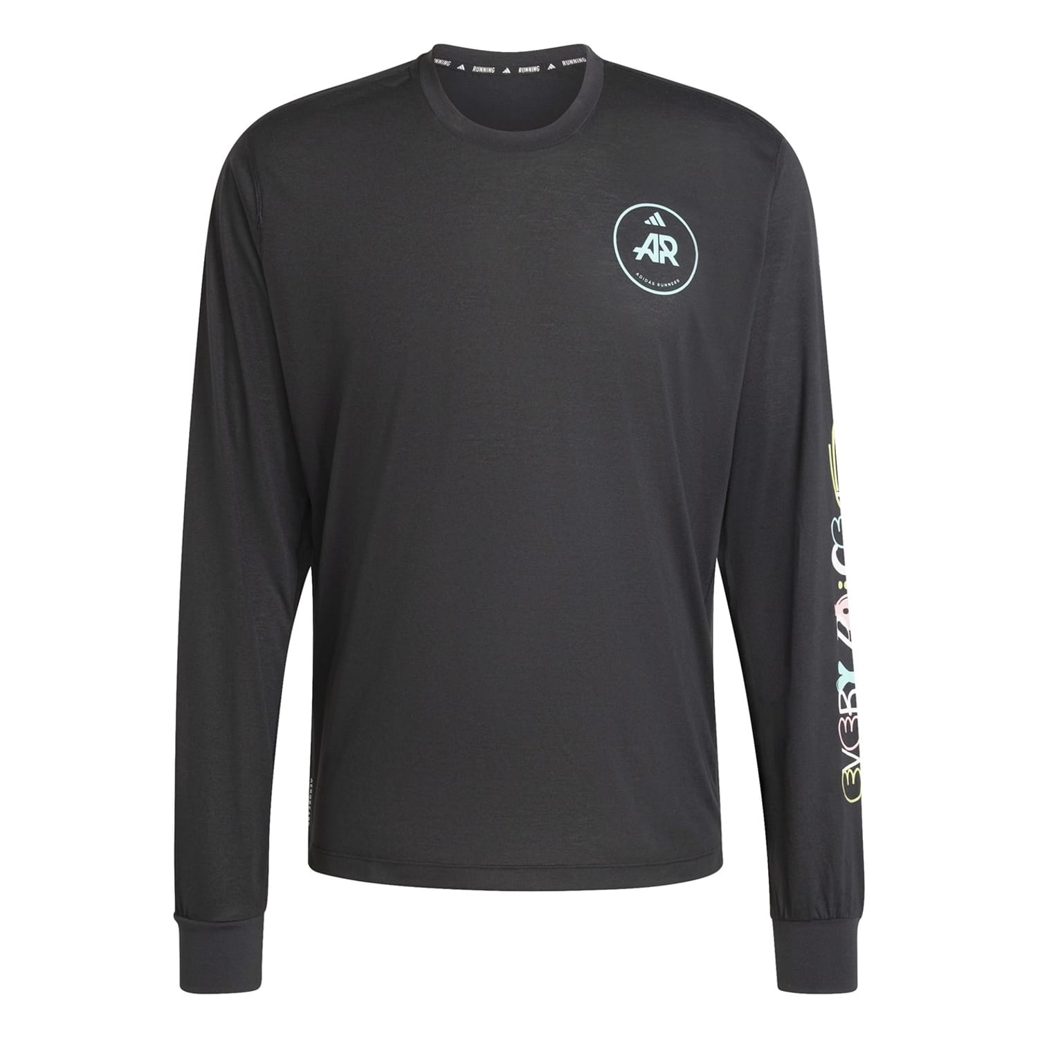 This adidas top features a crew neck and long sleeves, designed for performance with a regular fit. The ribbed collar and ribbed cuffs add a touch of detail, while the straight hem ensures a clean finish. A graphic print with lettering and a chest logo complete the look, making it a stylish choice for any casual occasion. -
