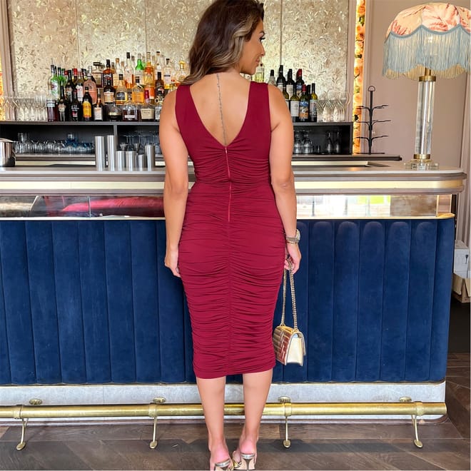 Look and feel gorgeous in our V Neck Ruched Bodycon Midi Dress. Featuring a V shaped neckline and V shaped back, a ruched midi skirt and zip up back. Style with strappy heels and your favourite jewellery for the perfect party outfit.