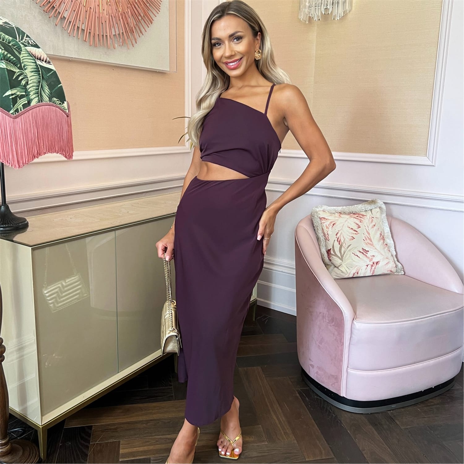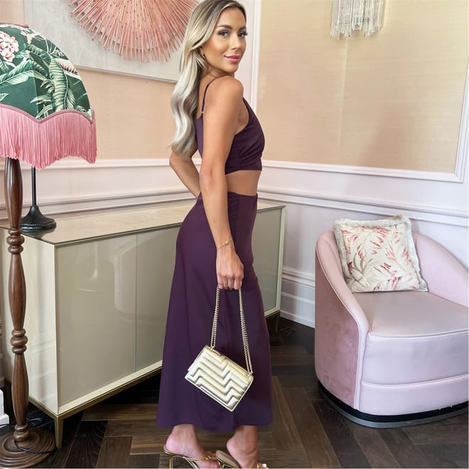 Our Asymmetric Cut Out Midi Dress combines a classic silhouette with a modern cut out detail, making it the perfect evening dress!Featuring an asymmetric neckline, spaghetti straps, an asymmetric cutout detail, side zip and a midi length skirt. Pair it with barely there heels and some simple jewellery for a sophisticated look.