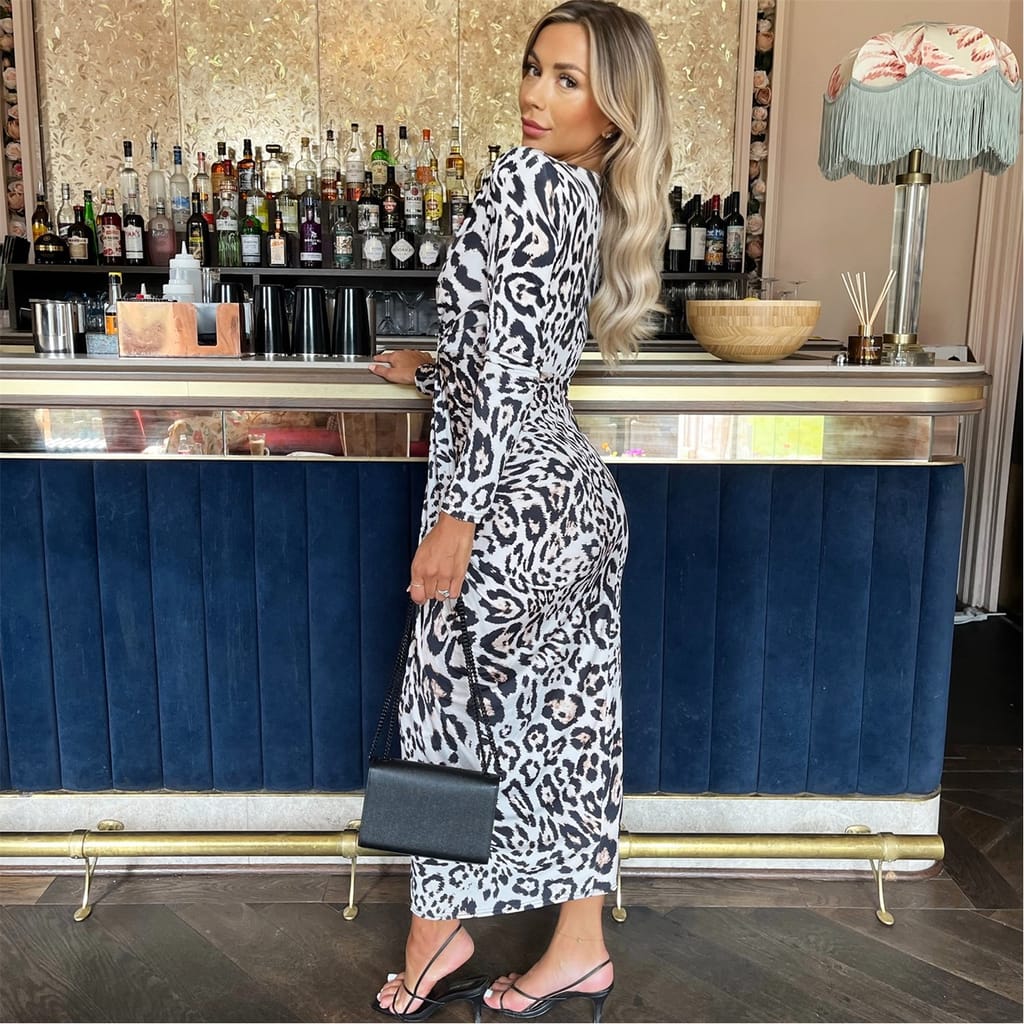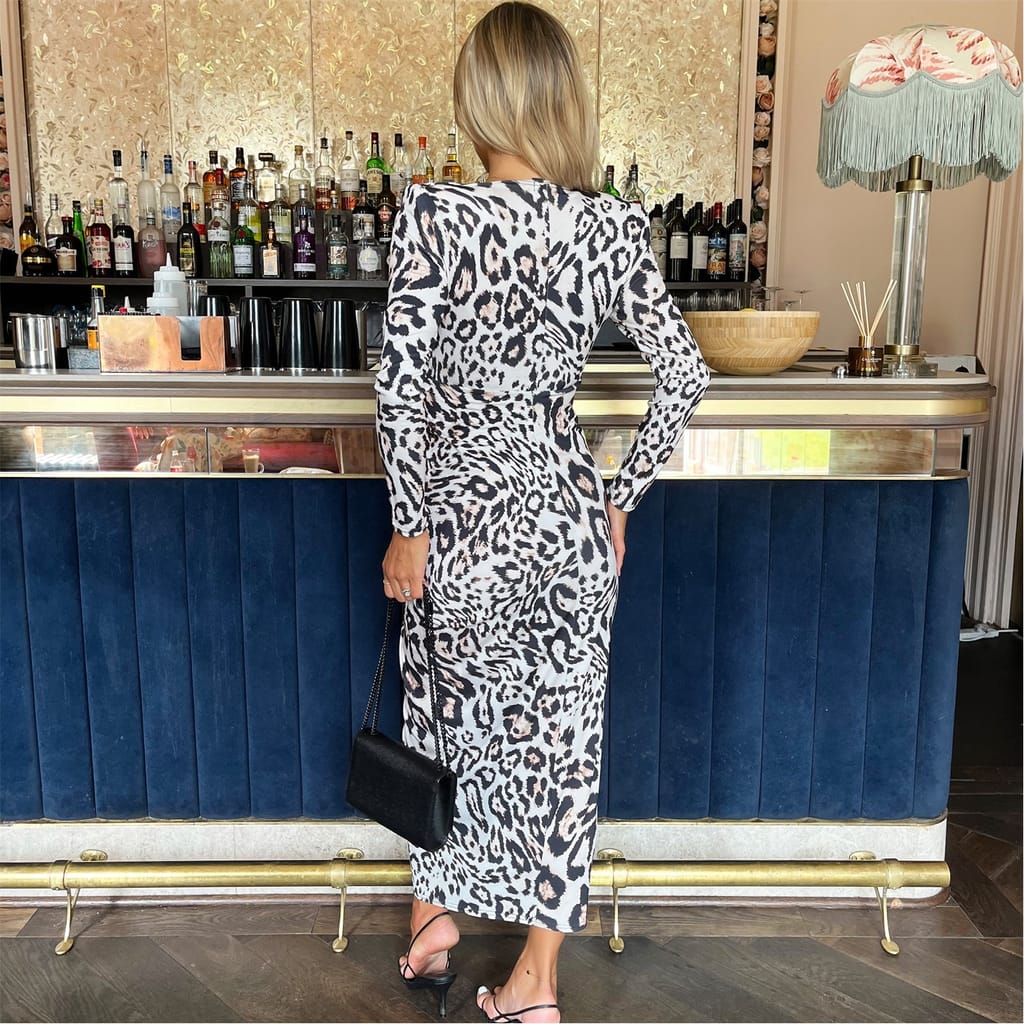 If you are looking for a sophisticated and on-trend outfit, look no further than our Cream Leopard Print Long Sleeve V Neck Knot Drape Midi Dress. This stunning dress features a bodycon silhouette, a deep V neck, shoulder pads, long sleeves, a front knot drape detail and a midi length skirt. Pair it with some barely there heels and a matching clutch for the perfect occasion look.