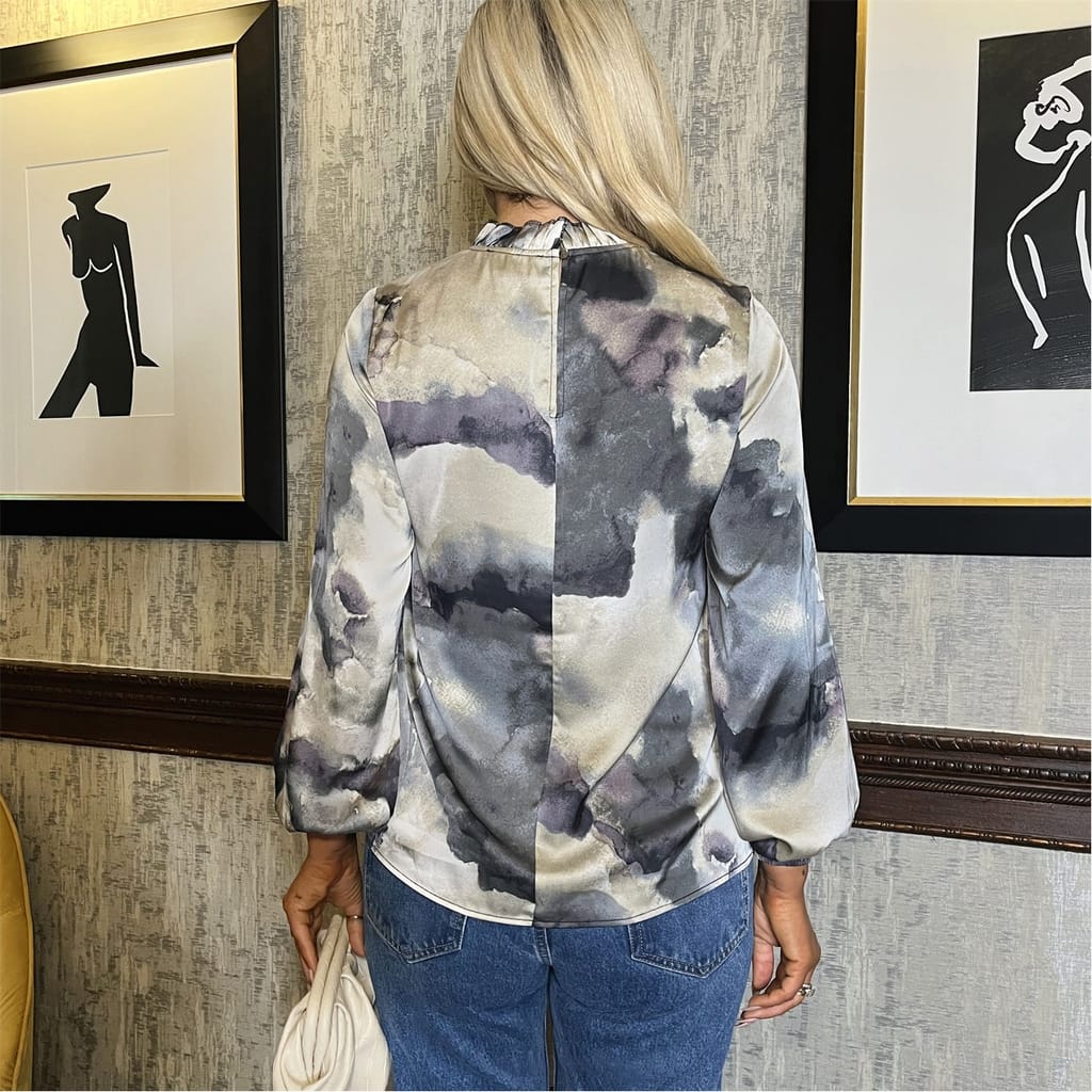 Take your outfit to the next level with our Multi Marble Print Long Sleeve Ruffle Neck Top. Featuring our gorgeous satin-feel fabric, a loose silhouette, long sleeves with elasticated cuffs, a high neck with ruffle detailing and loop button fastening behind the neck. Style with black jeans for a casual everyday look or black tailored trousers for a smart office look.
