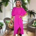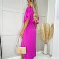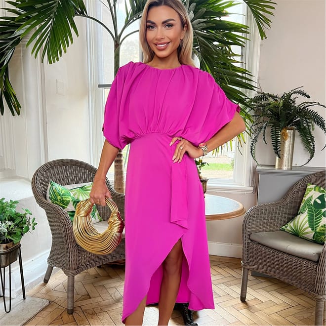 Look and feel gorgeous in our Hot Pink Batwing Top Wrap Skirt Midi Dress the perfect wedding guest dress. Featuring a ruched shoulder full top and a wrap midi length skirt. Style with strappy heels and minimal jewellery to complete the look.