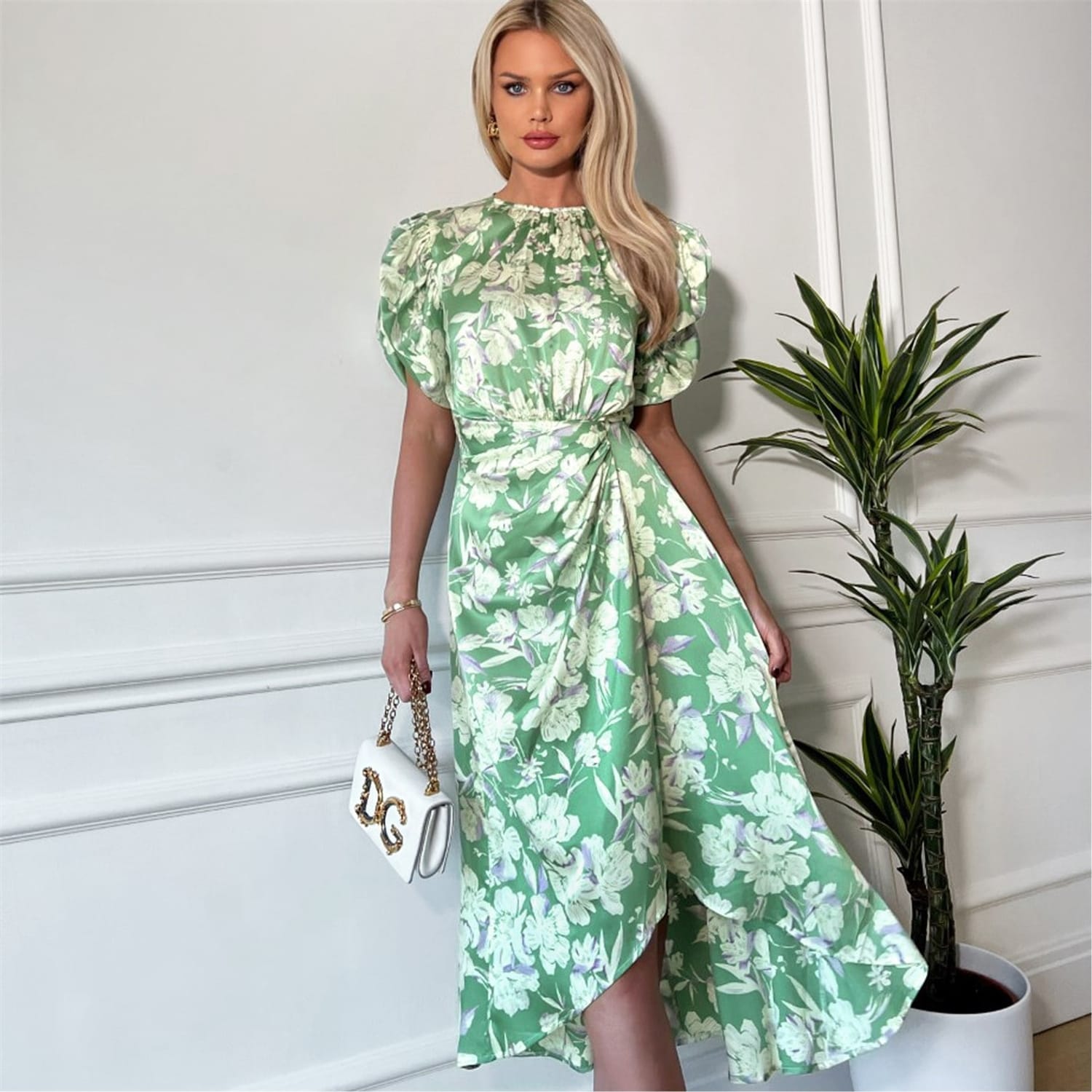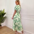 Stay on trend with this Green Floral Printed Short Puff Sleeve Gathered Side Midi Dress. Featuring puff sleeves, round neckline, midi length skirt with a gathered side detail and a zip up back. Style with flats or heels and add some sophisticated jewellery for a chic evening look.