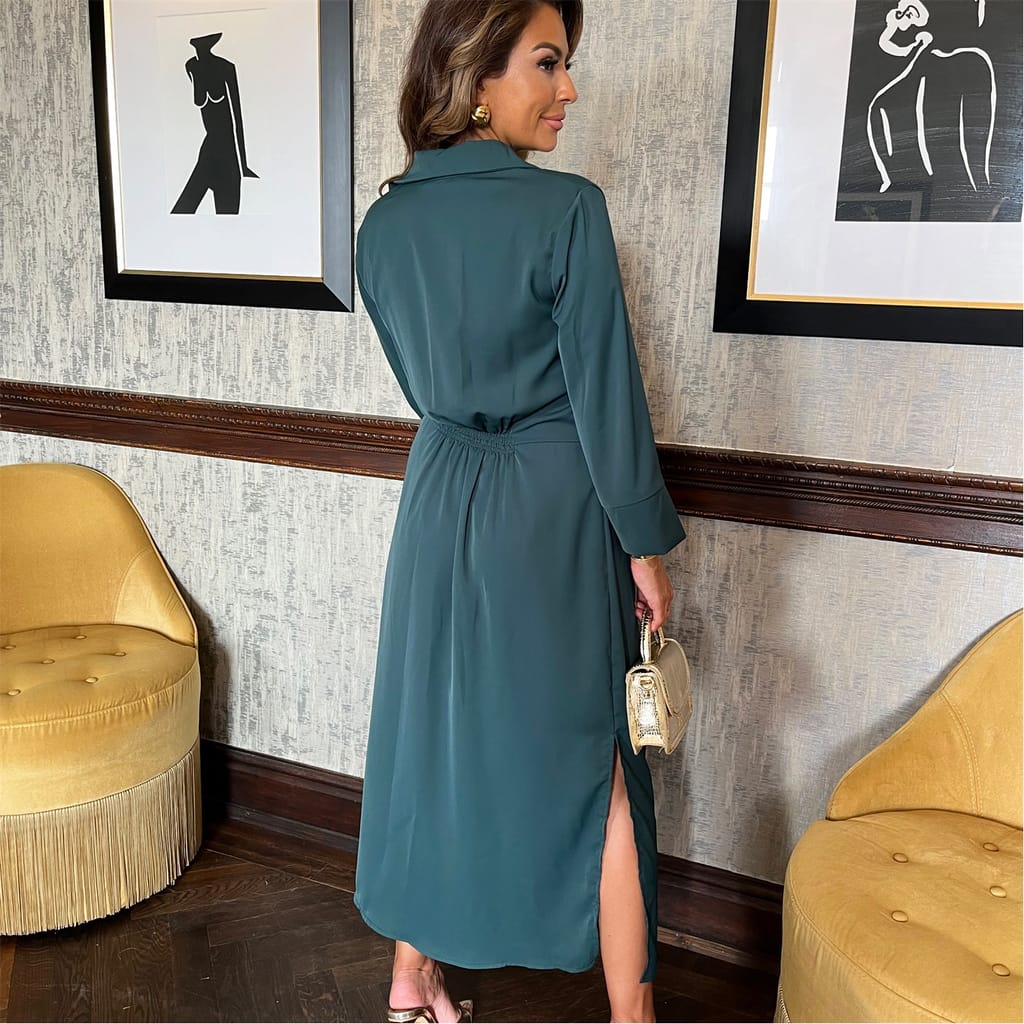 Stay on trend with this 3/4 Sleeves Gathered Waist Shirt Midi Dress. Featuring 3/4 length cuffed sleeves , a classic collar, a button front top with side gathering on the waist, an elasticated waist back and a midi length skirt with side splits. Style with flats or heels and add some sophisticated jewellery for a chic evening look.