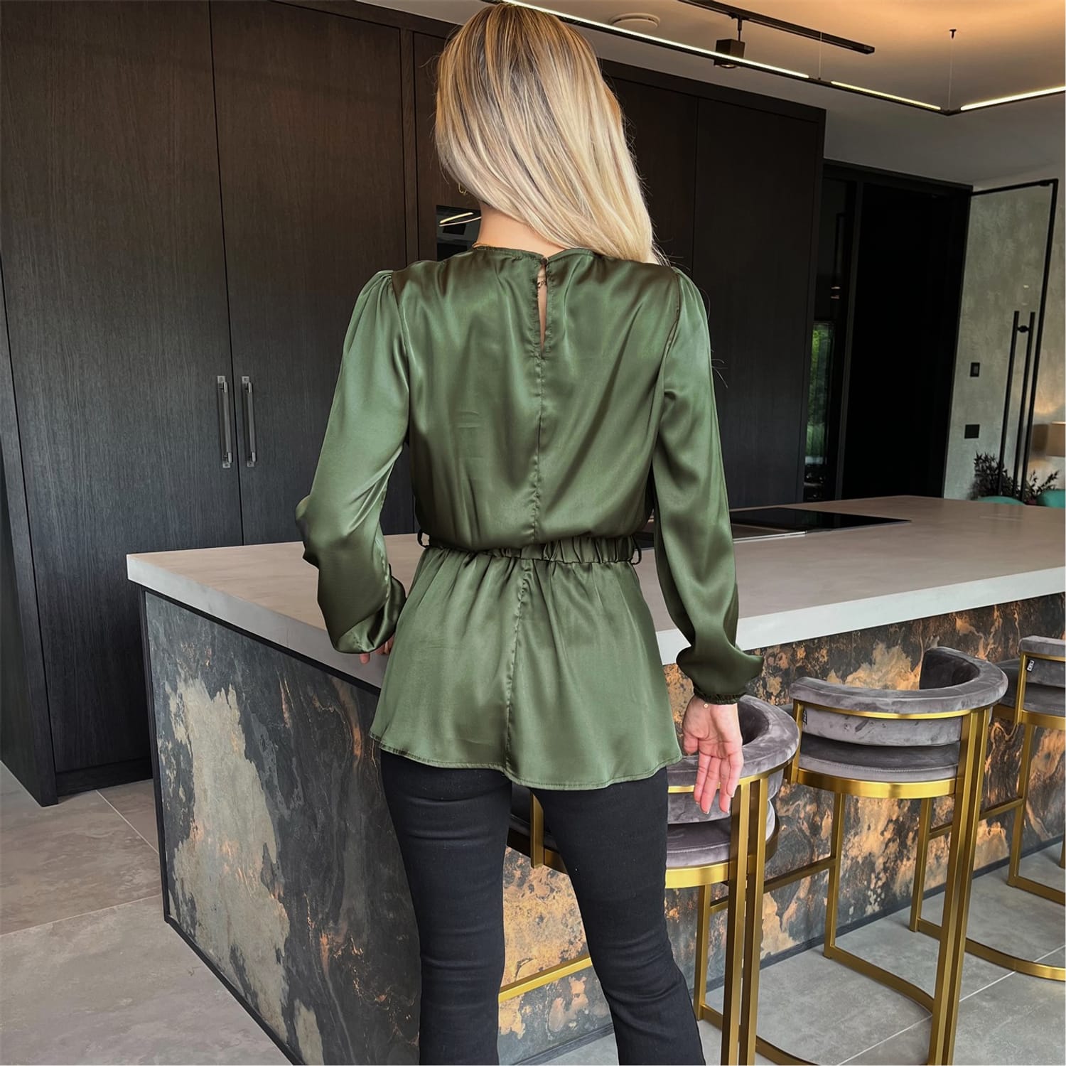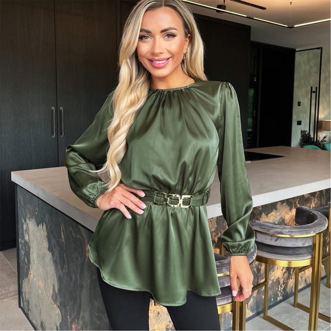 Our flattering Satin Long Sleeve Gold Detail Belt Top will see you from the office to Friday night drinks. Featuring long elasticated cuff sleeves, an elasticated waist with an elasticated belt with gold detailing and a button back neck fastening. Style with simple jewelry, jeans and some heels for an effortless dressed up look!