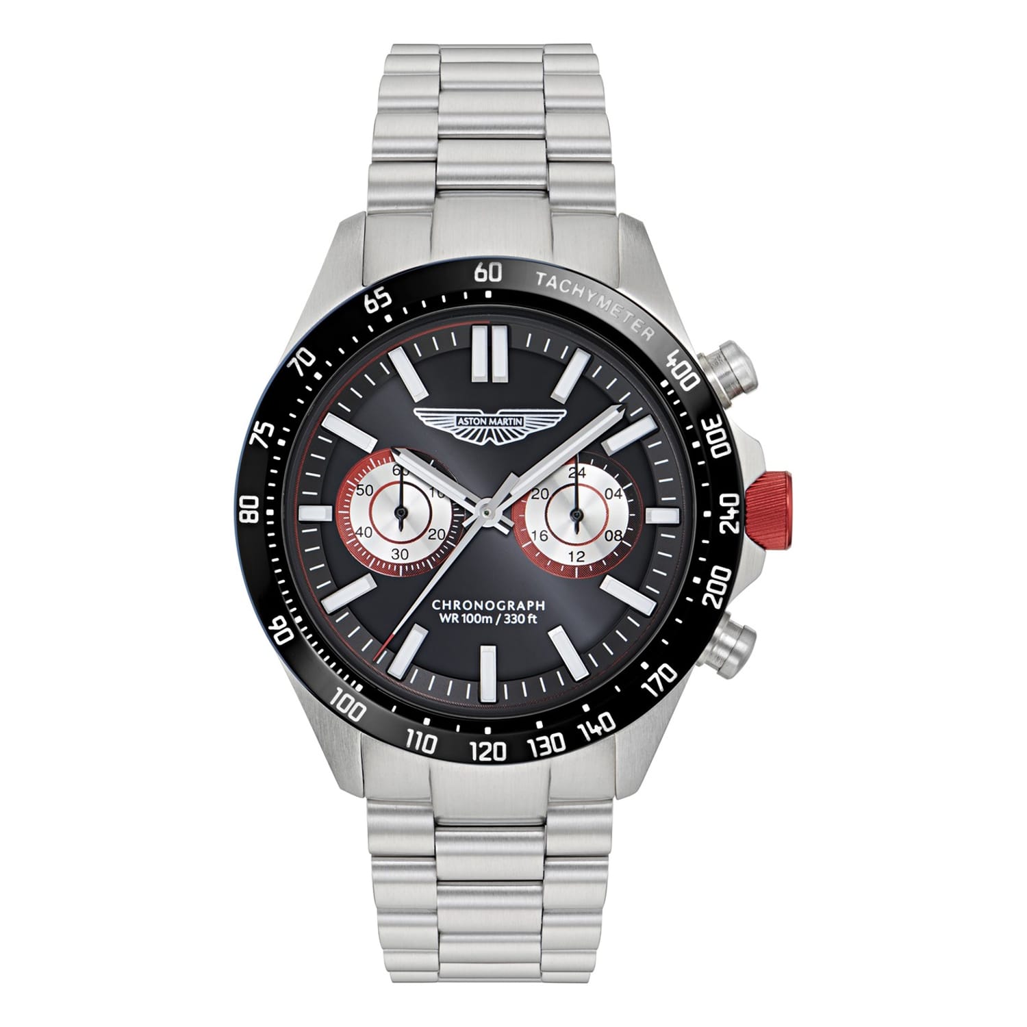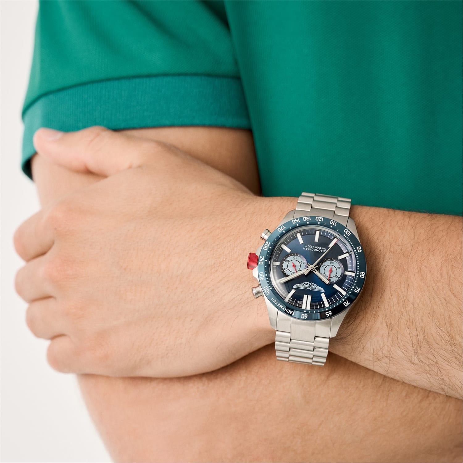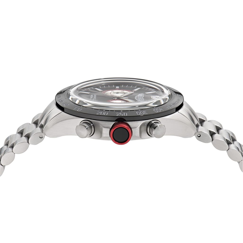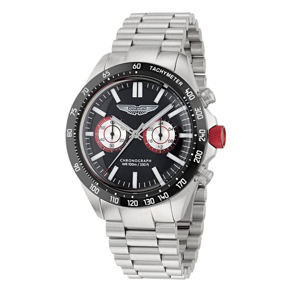 Meet SPT, a chronograph built to impress. This bold 44mm RSST case matching with the bracelet houses a deep dial with twin subdials and the Aston Martin Wings logo, delivering a strong, purposeful look. A tachymeter scale encircles the bezel for added utility, while vibrant accents on the dial and crown infuse a dose of racing energy. -