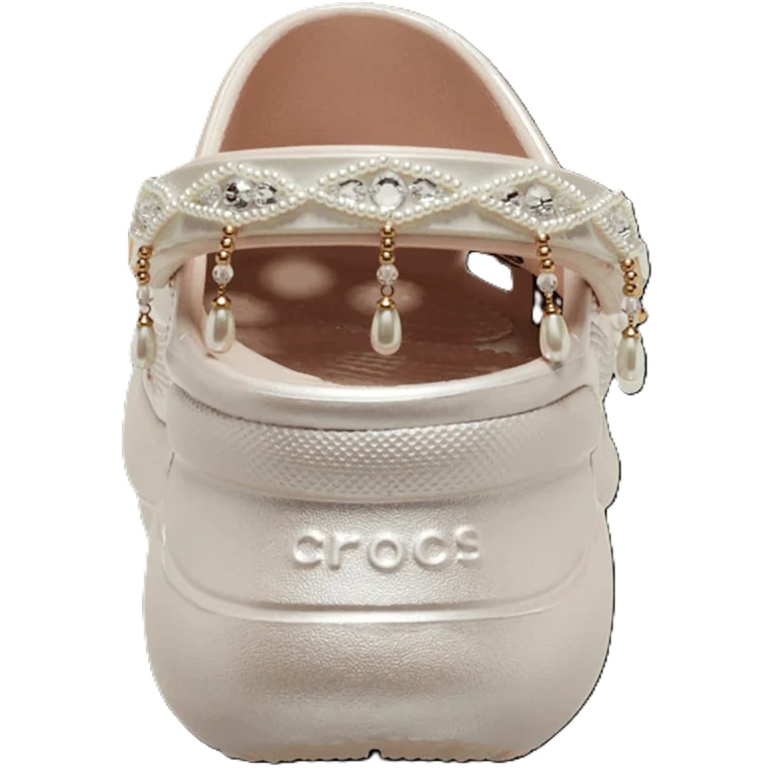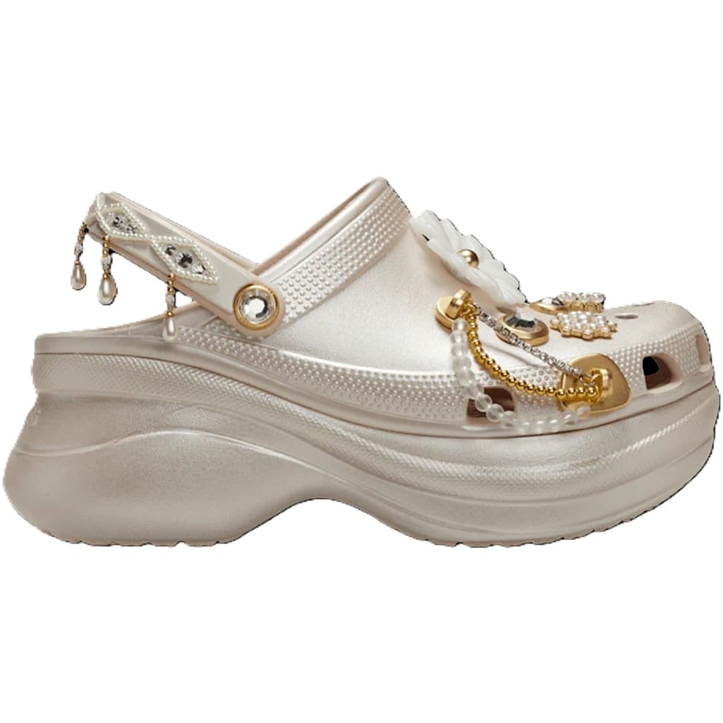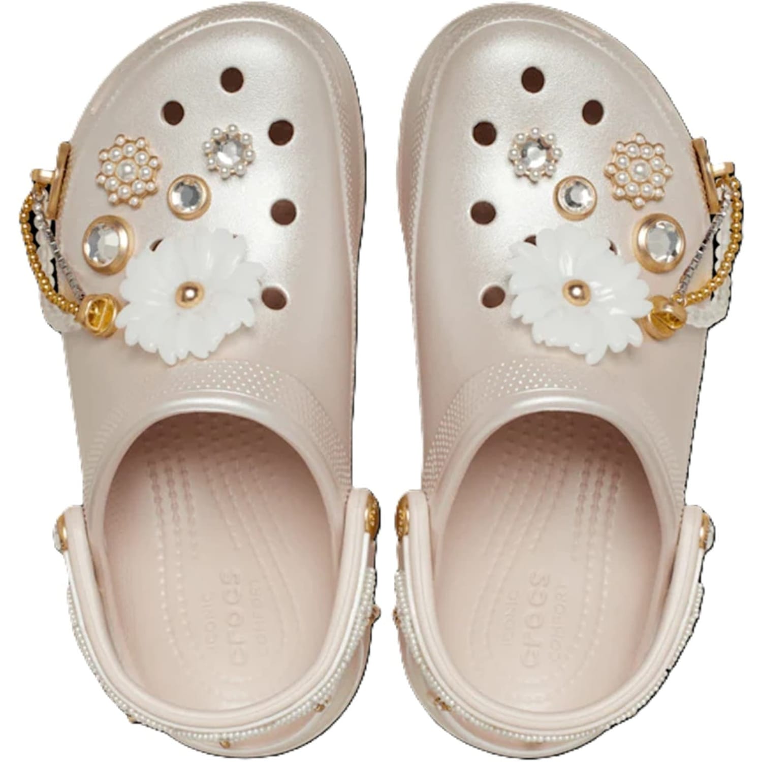 Step into style with these bedazzled Crocs clogs, featuring a unique graphic pattern. Designed with a round, closed toe, these Shuv-style sandals offer a distinctive look. Perfect for those who appreciate both comfort and flair, these shoes are a standout choice for any casual outing. -