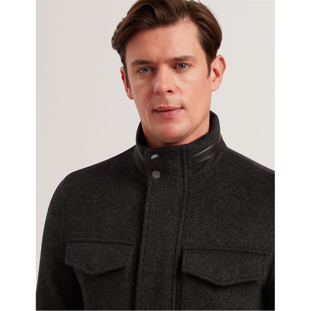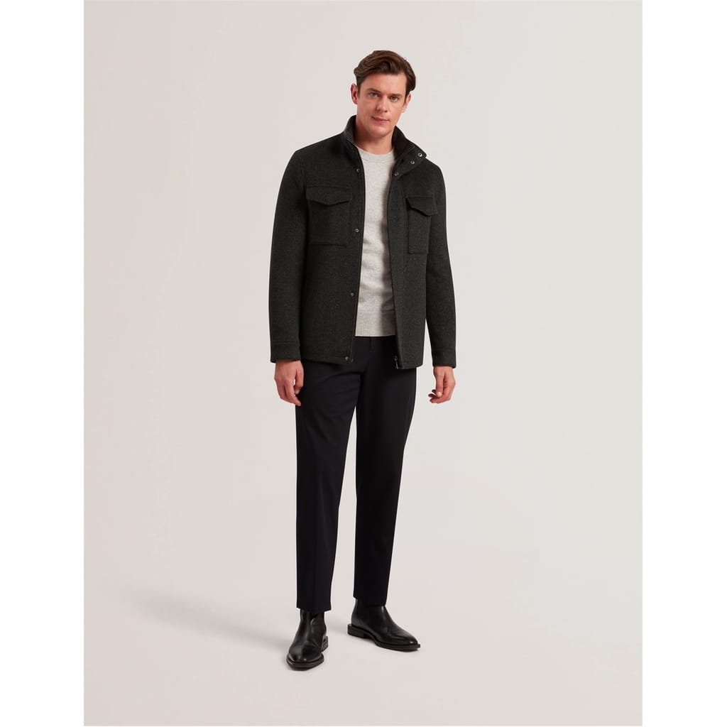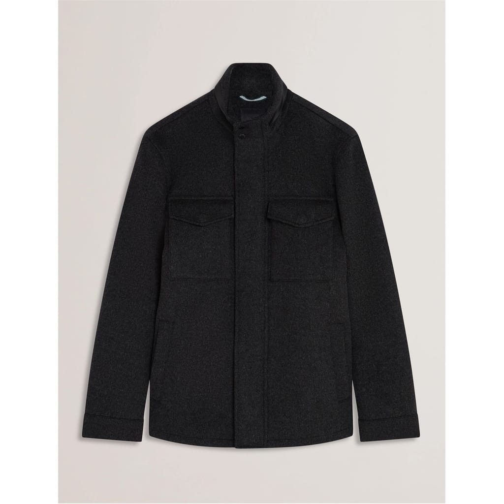 Ted Baker's overcoat features a high collar and a straight hem, offering a regular fit. This solid short coat is equipped with a snap button and zipper closure, providing both style and functionality. The design includes practical flap pockets, making it a versatile addition to your wardrobe. -