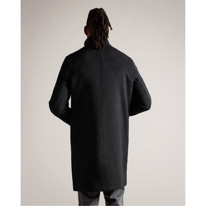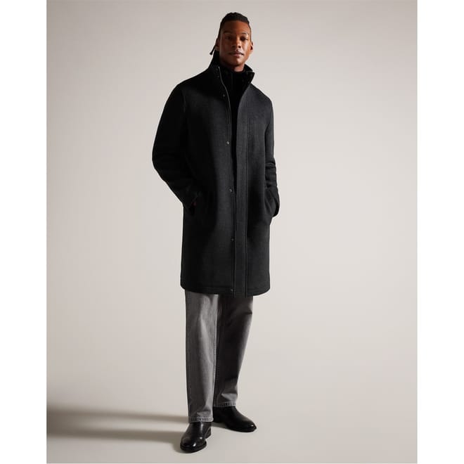 Ted Baker's overcoat is a winter essential, featuring a high neck and high collar for added warmth. The solid pattern and regular fit offer a classic look, while the snap button closure ensures practicality. Designed with a straight hem and pockets, this coat combines style and functionality for the colder months. -