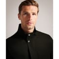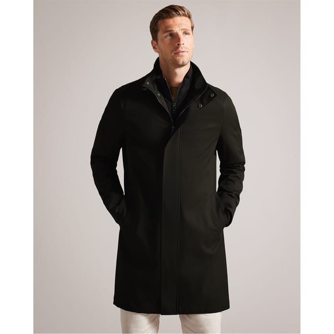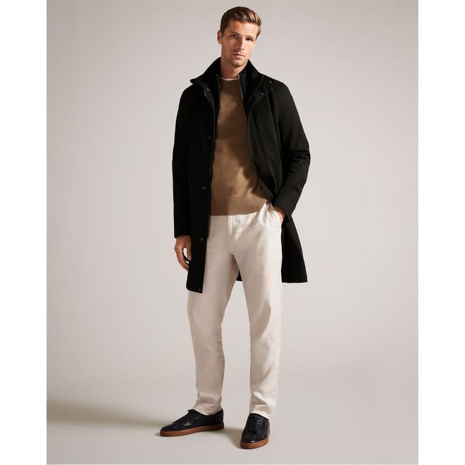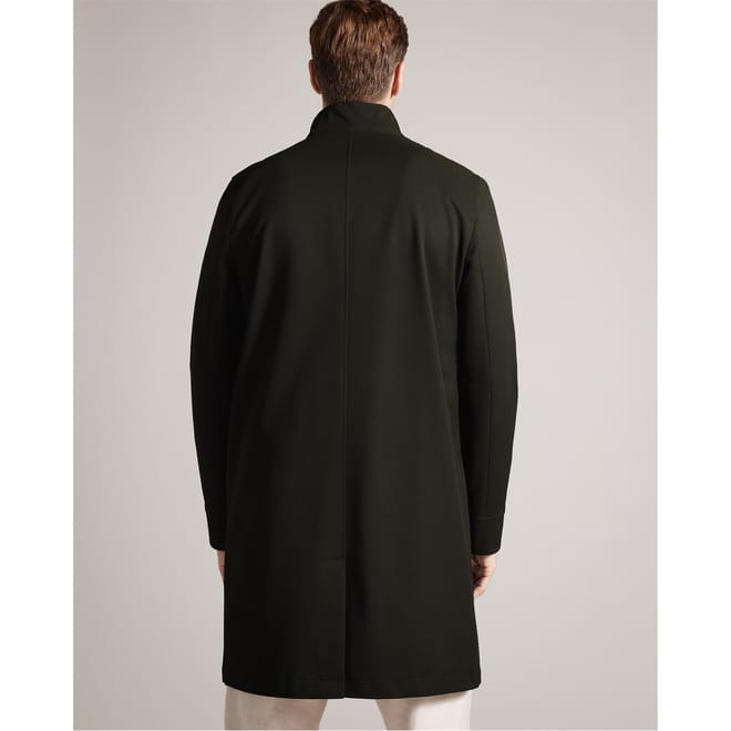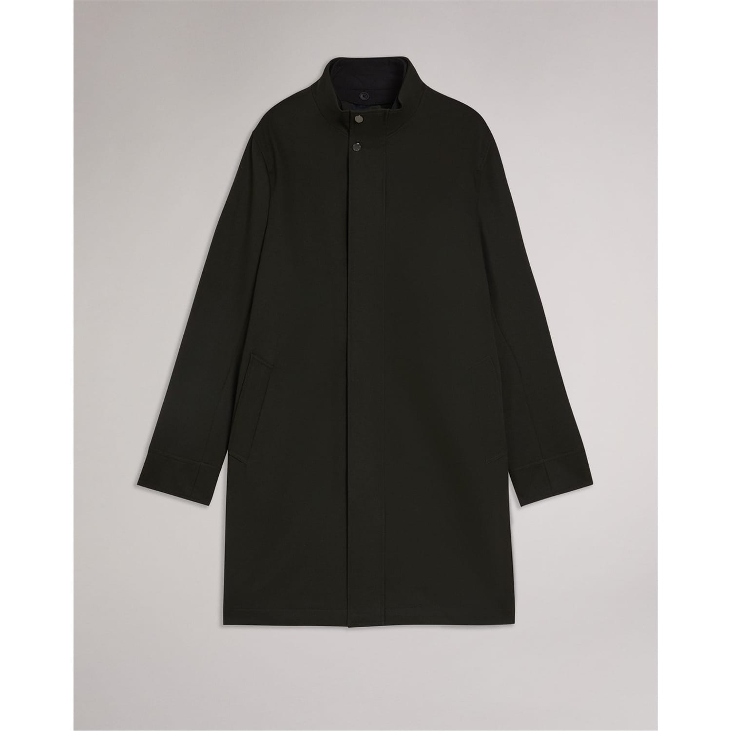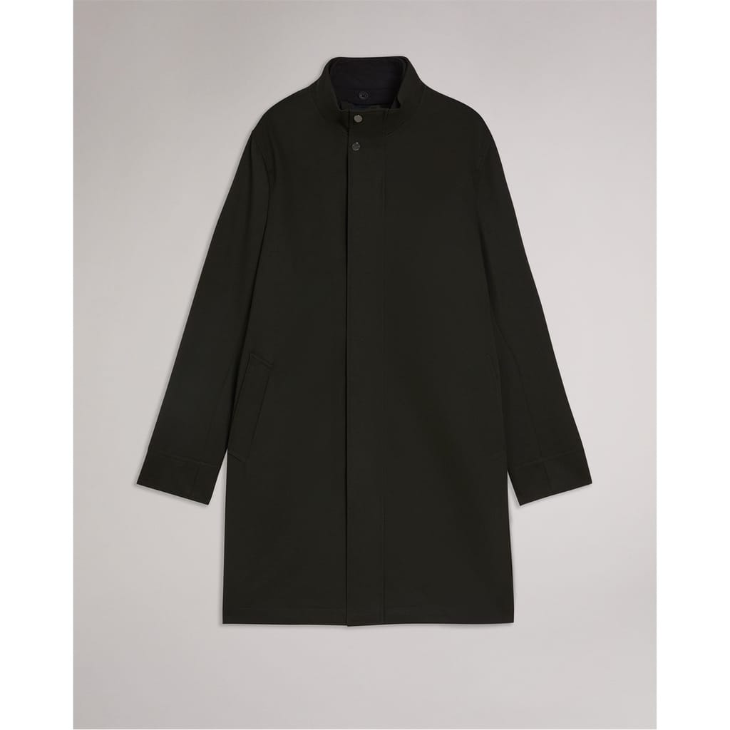 This Ted Baker overcoat features a high collar and a straight hem, offering a regular fit. The solid pattern adds a classic touch, while the button closure ensures a secure fit. Designed with side pockets for added functionality, this coat is perfect for those seeking a blend of style and practicality. -