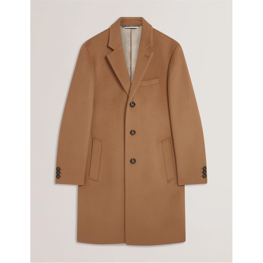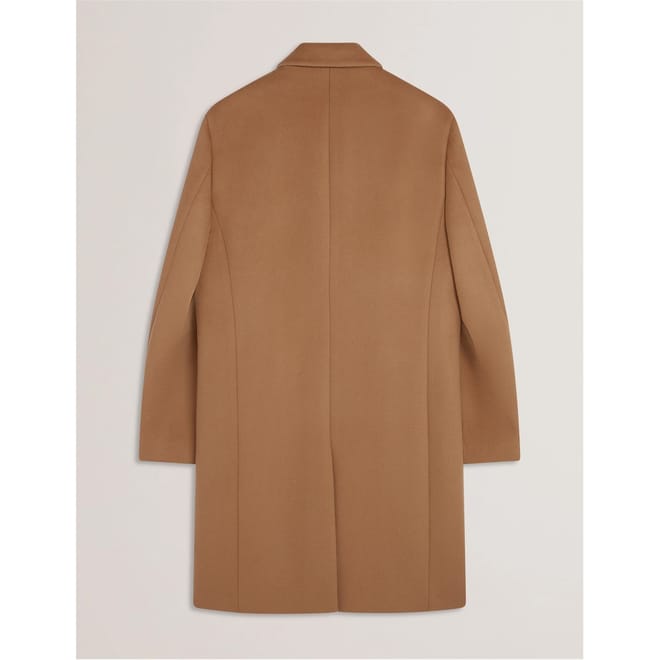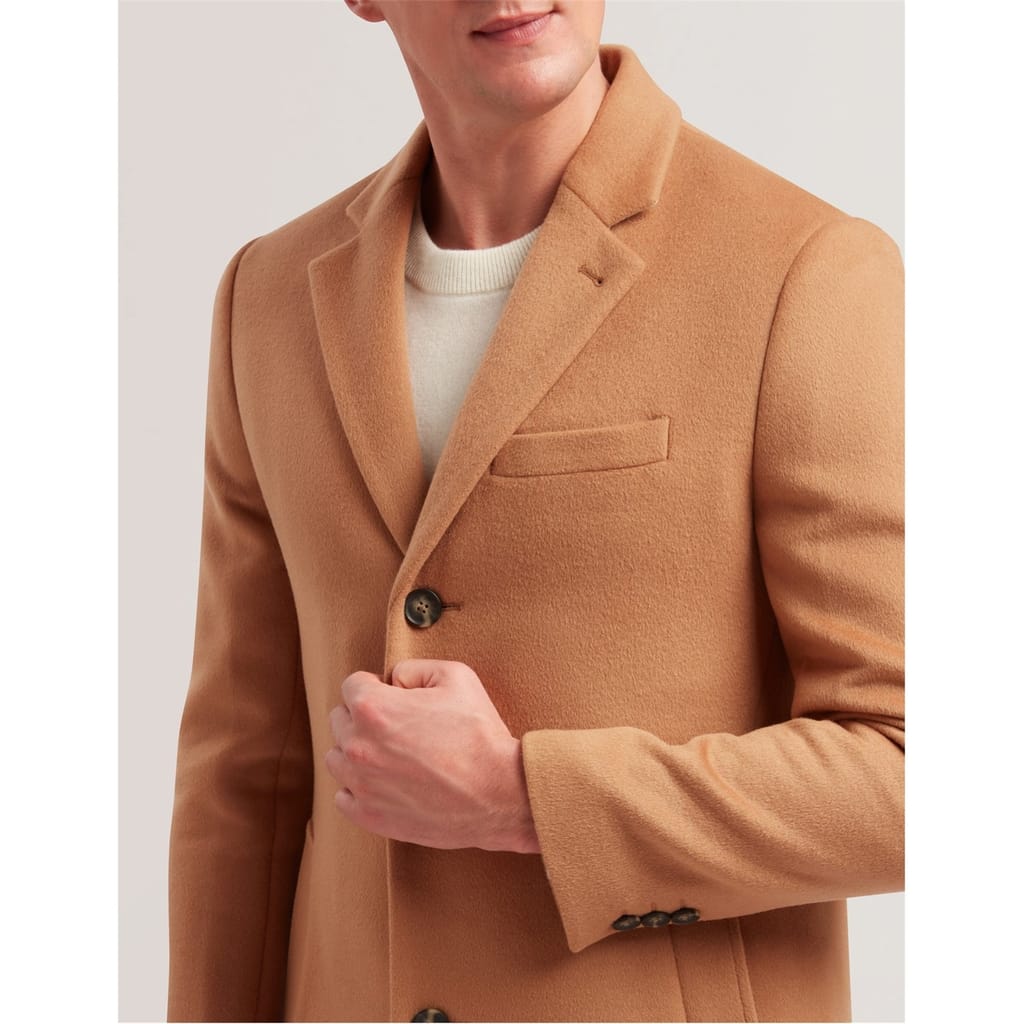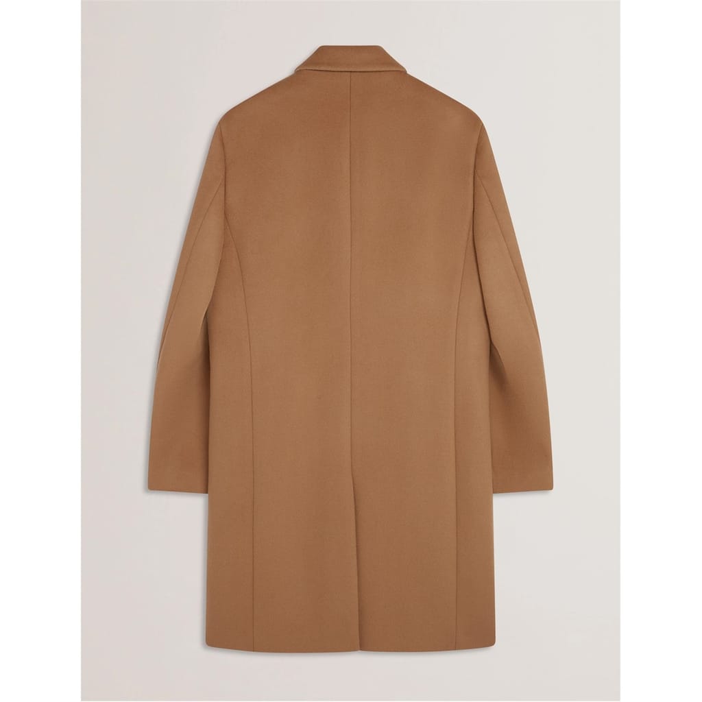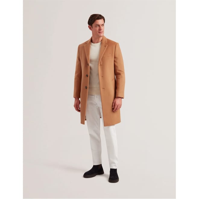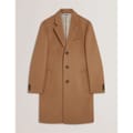 This Ted Baker overcoat is a winter essential, featuring a lapel collar and a straight hem. Designed with a regular fit, it offers a solid pattern and button closure. The coat is equipped with practical pockets and flap pockets, making it both stylish and functional for the colder months. -