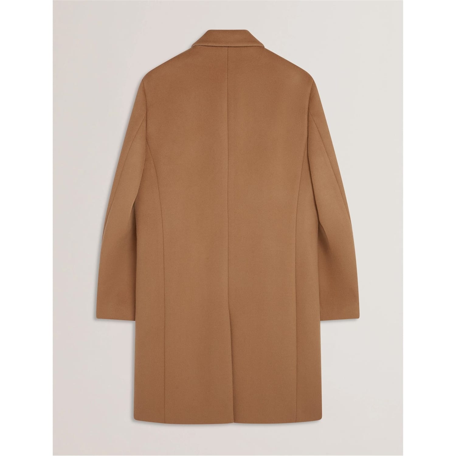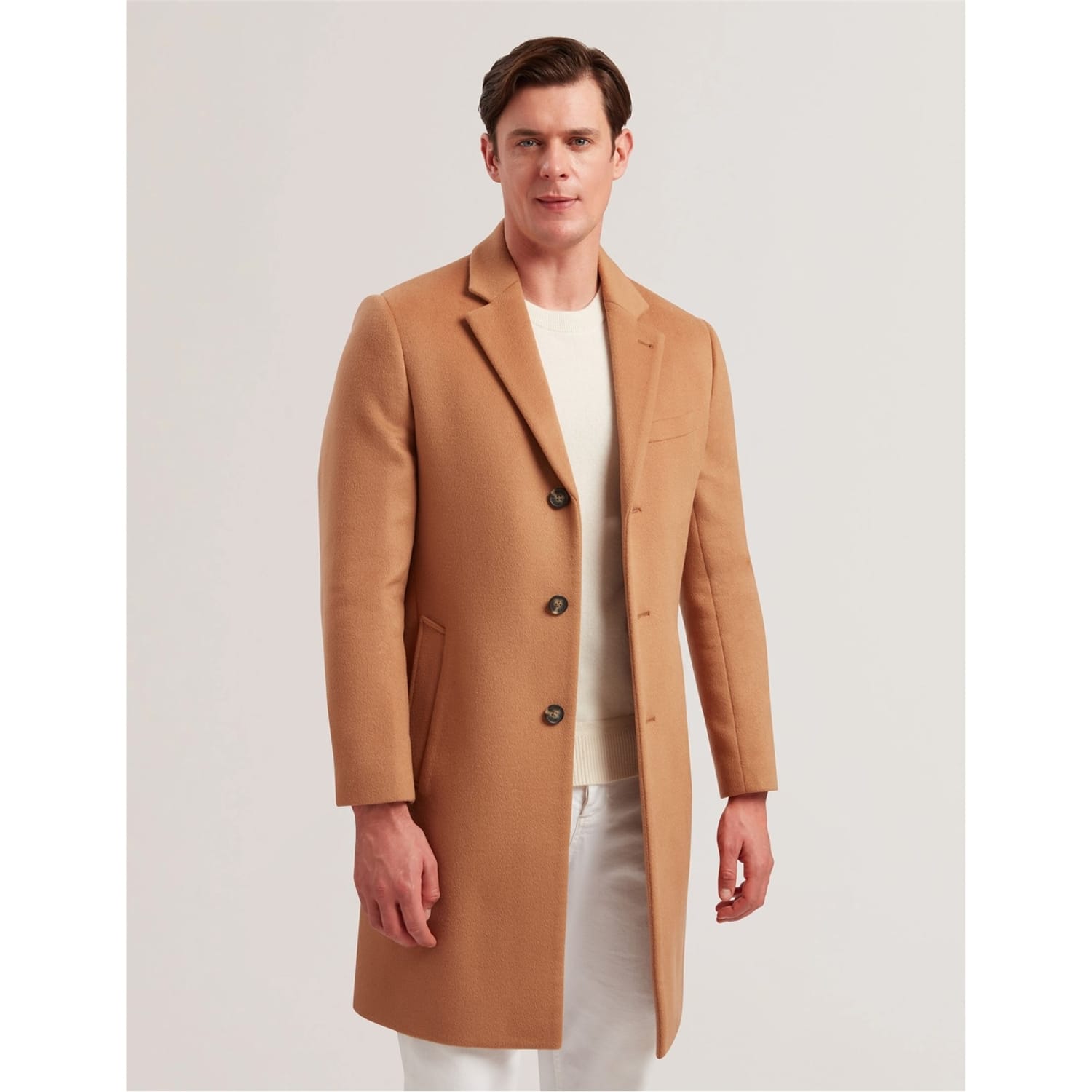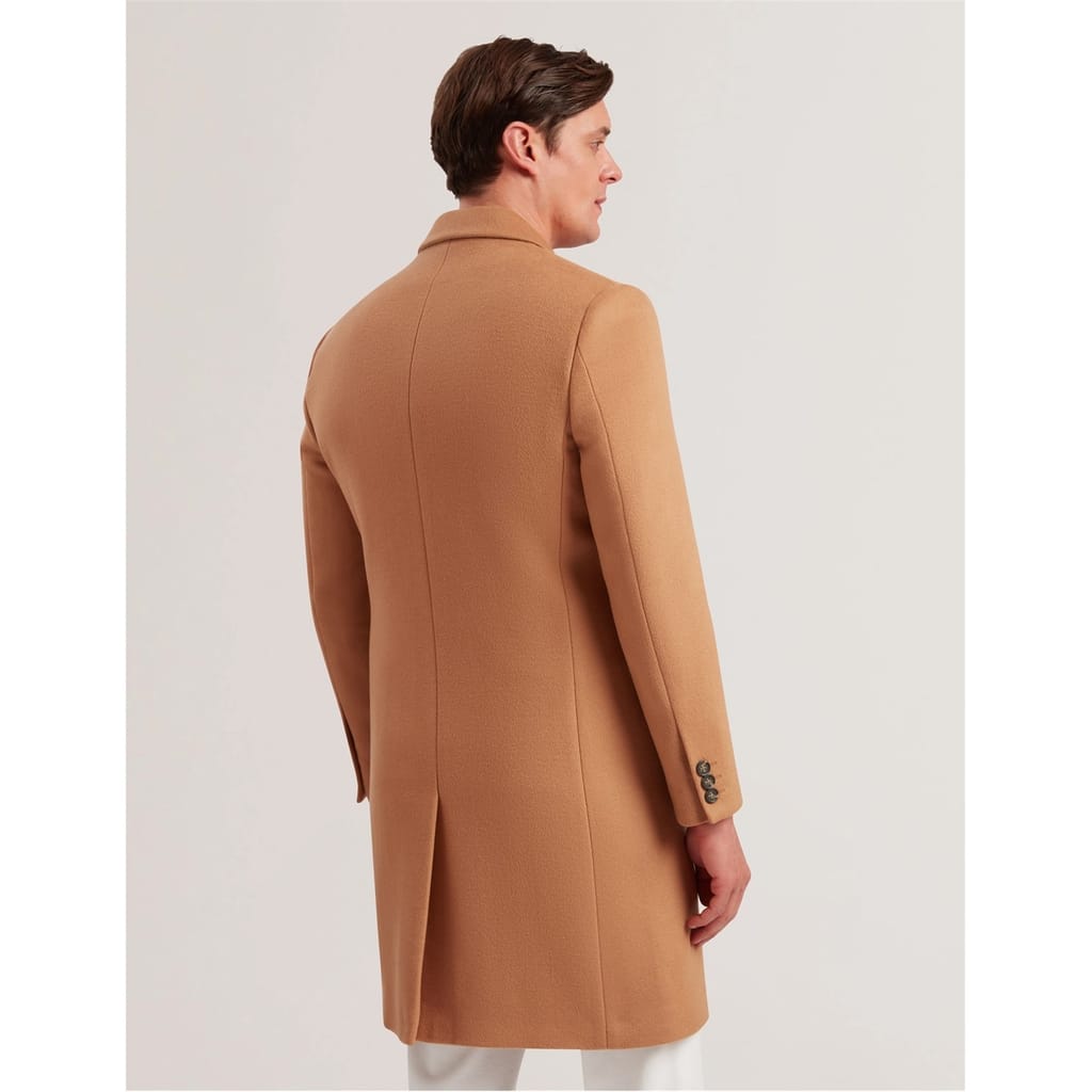 This Ted Baker overcoat is a winter essential, featuring a lapel collar and a straight hem. Designed with a regular fit, it offers a solid pattern and button closure. The coat is equipped with practical pockets and flap pockets, making it both stylish and functional for the colder months. -
