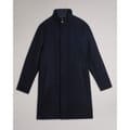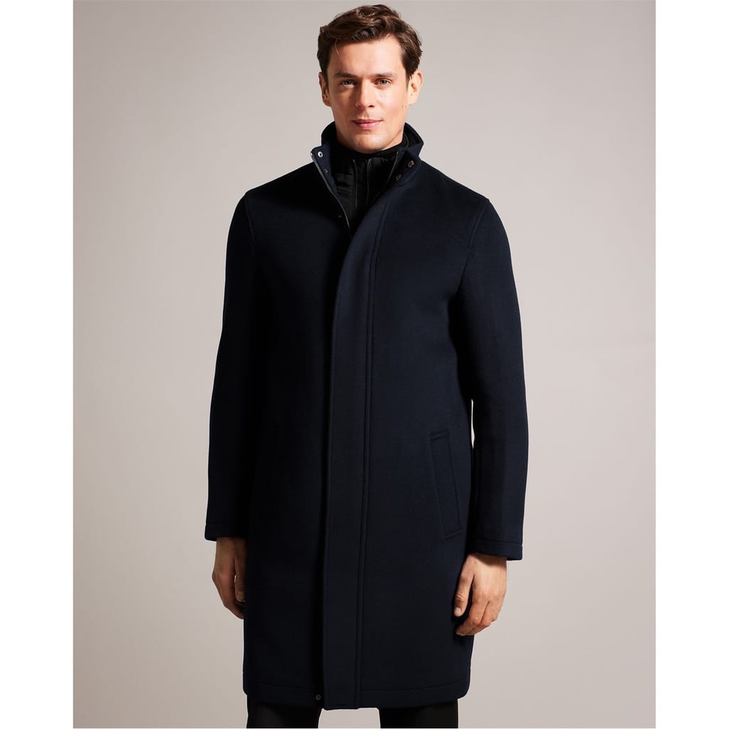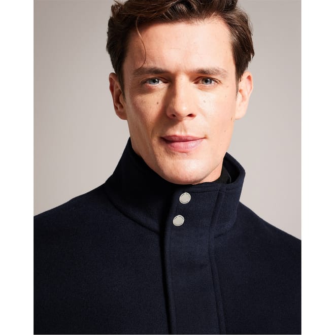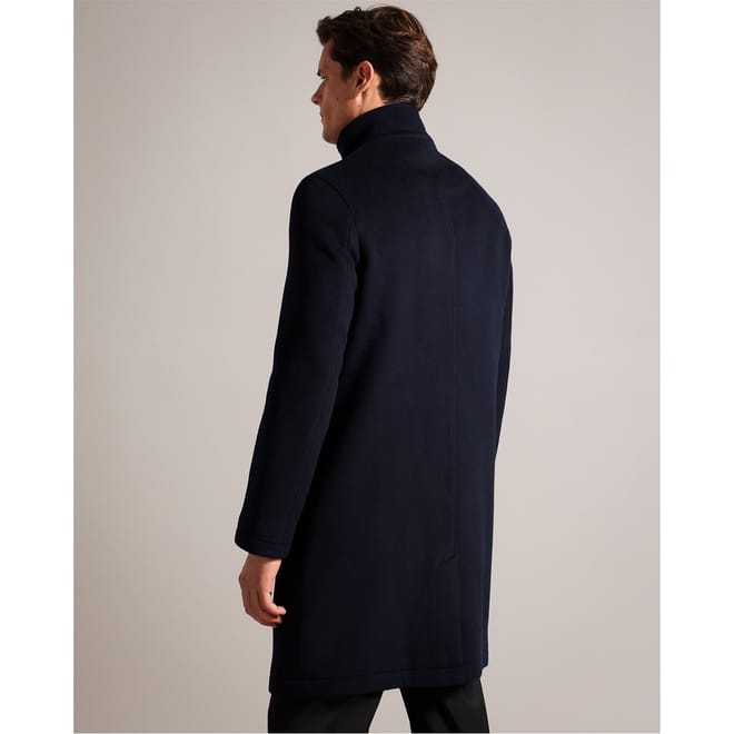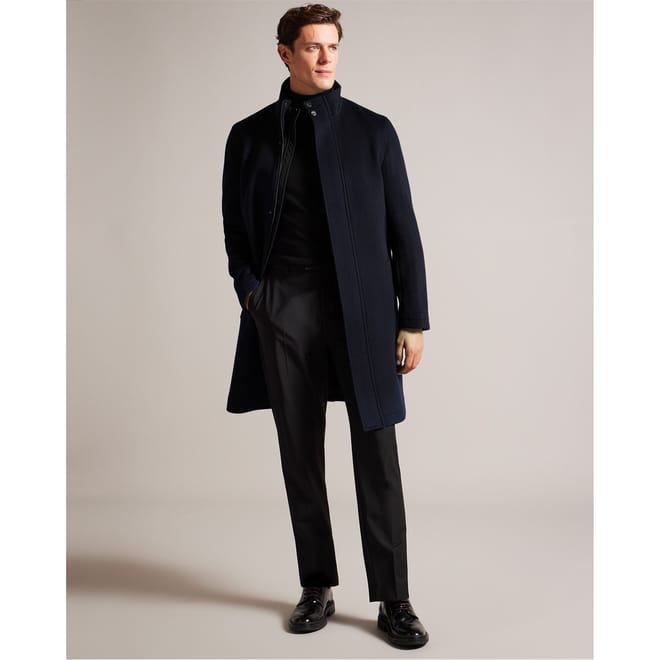 This Ted Baker overcoat is a winter essential, featuring a high neck and high collar for added warmth. The regular fit ensures comfort, while the solid pattern offers a classic look. It includes a straight hem and practical pockets. The coat is designed with a snap button and concealed zipper closure, making it both stylish and functional for the colder months. -