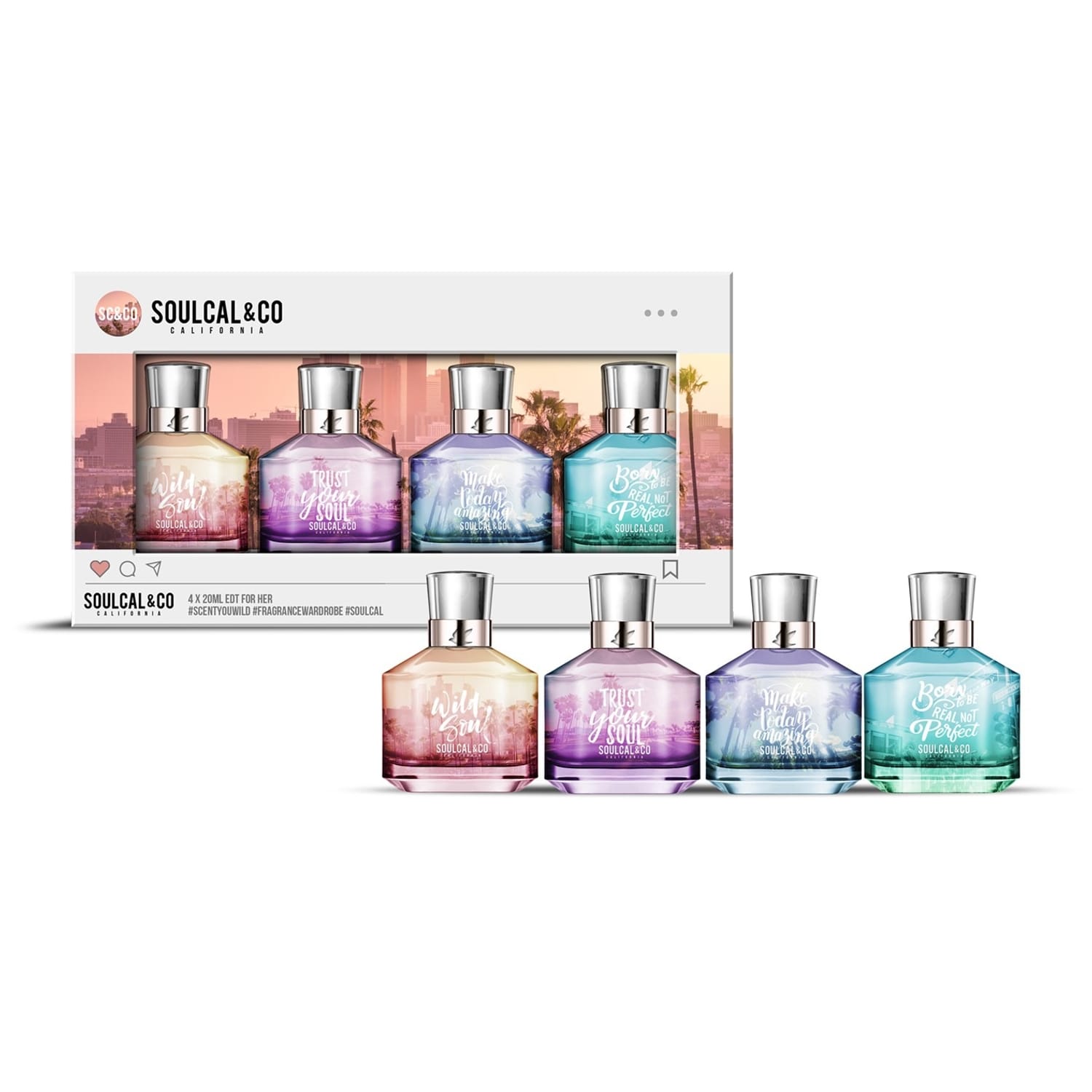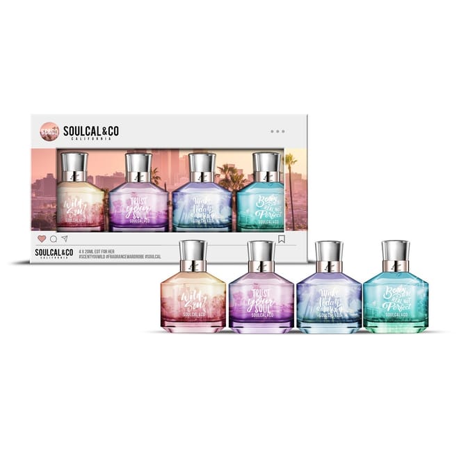Embrace every mood with the Soul Cal 4 x 20ml Eau De Toilette Fragrance Collection for Her. This chic set features four irresistible scents, from light and floral to warm and sensual — perfect for any occasion. Each 20ml bottle is beautifully compact and travel-friendly, making it easy to switch up your scent wherever life takes you. Whether you’re feeling playful, confident, or effortlessly elegant, there’s a fragrance to match your vibe. Discover your perfect blend of style and spirit with Soul Cal — fresh, feminine, and full of energy. -