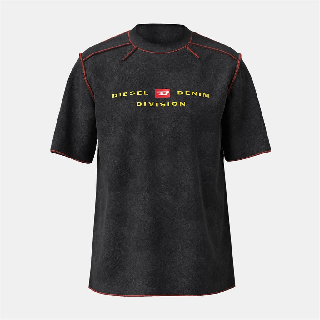 This Diesel top features a regular fit with a crew neck and short raglan sleeves. The design is enhanced by a straight hem and a striking logo print. The front logo and contrast stitch add a distinctive touch, making it a standout piece in any wardrobe. -
