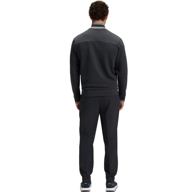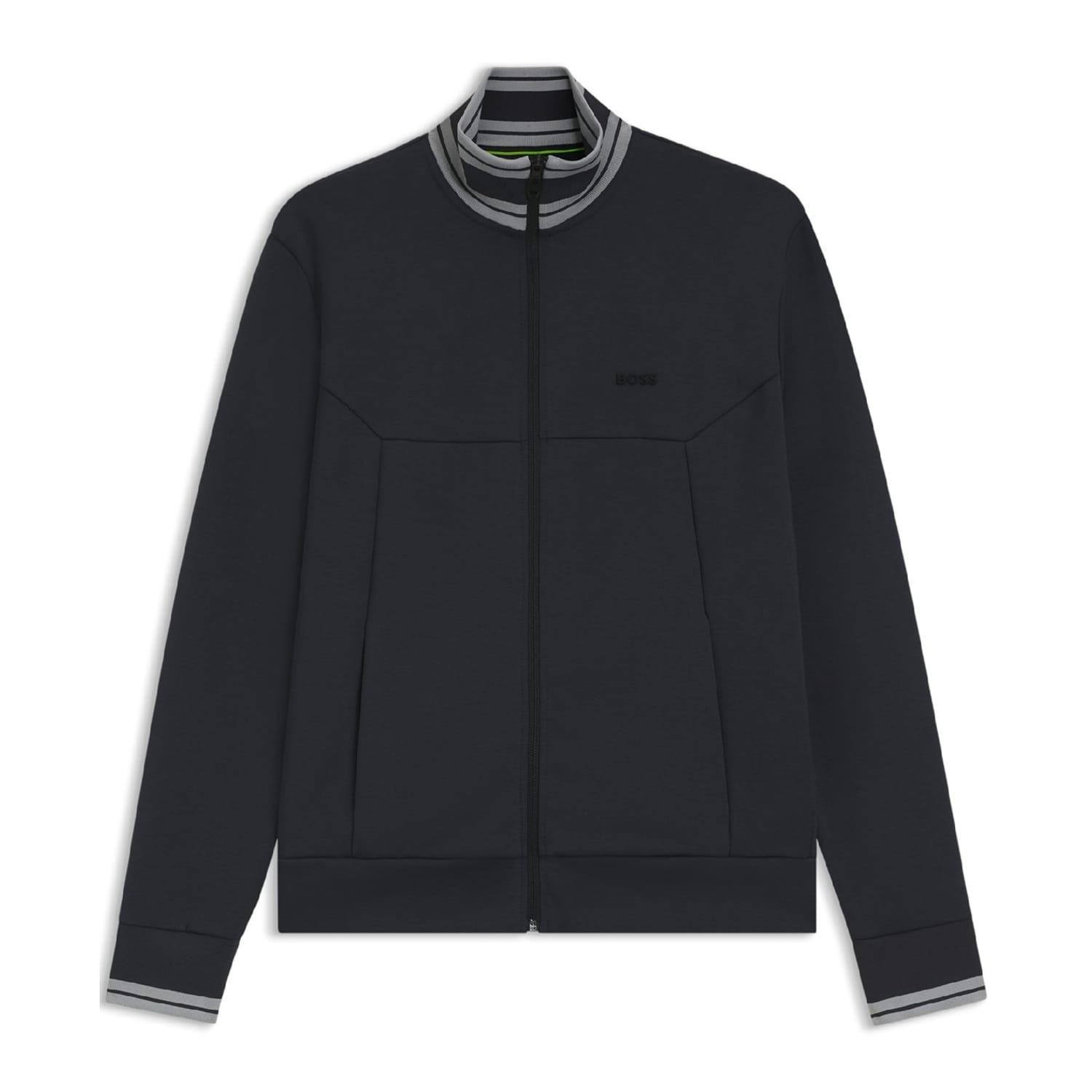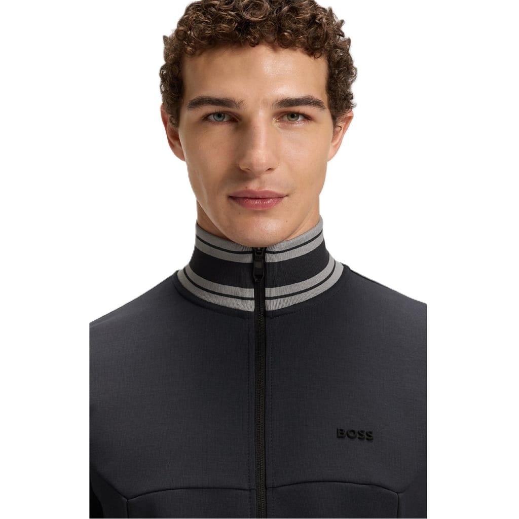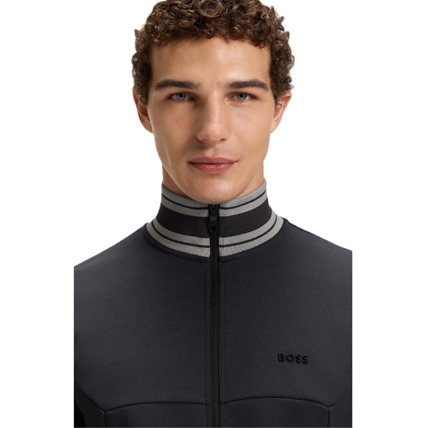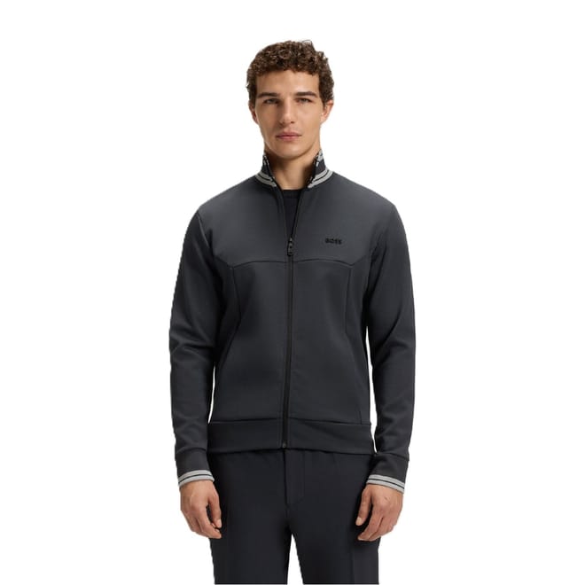 This Boss track jacket features a regular fit with a short length, offering a stylish and comfortable option for casual wear. The jacket is designed with a zip neck and a front zipper closure, complemented by ribbed cuffs, collar, and hem for a snug fit. It showcases a horizontal stripe pattern and includes zipped pockets for practicality. The embroidered logo adds a touch of brand identity. -