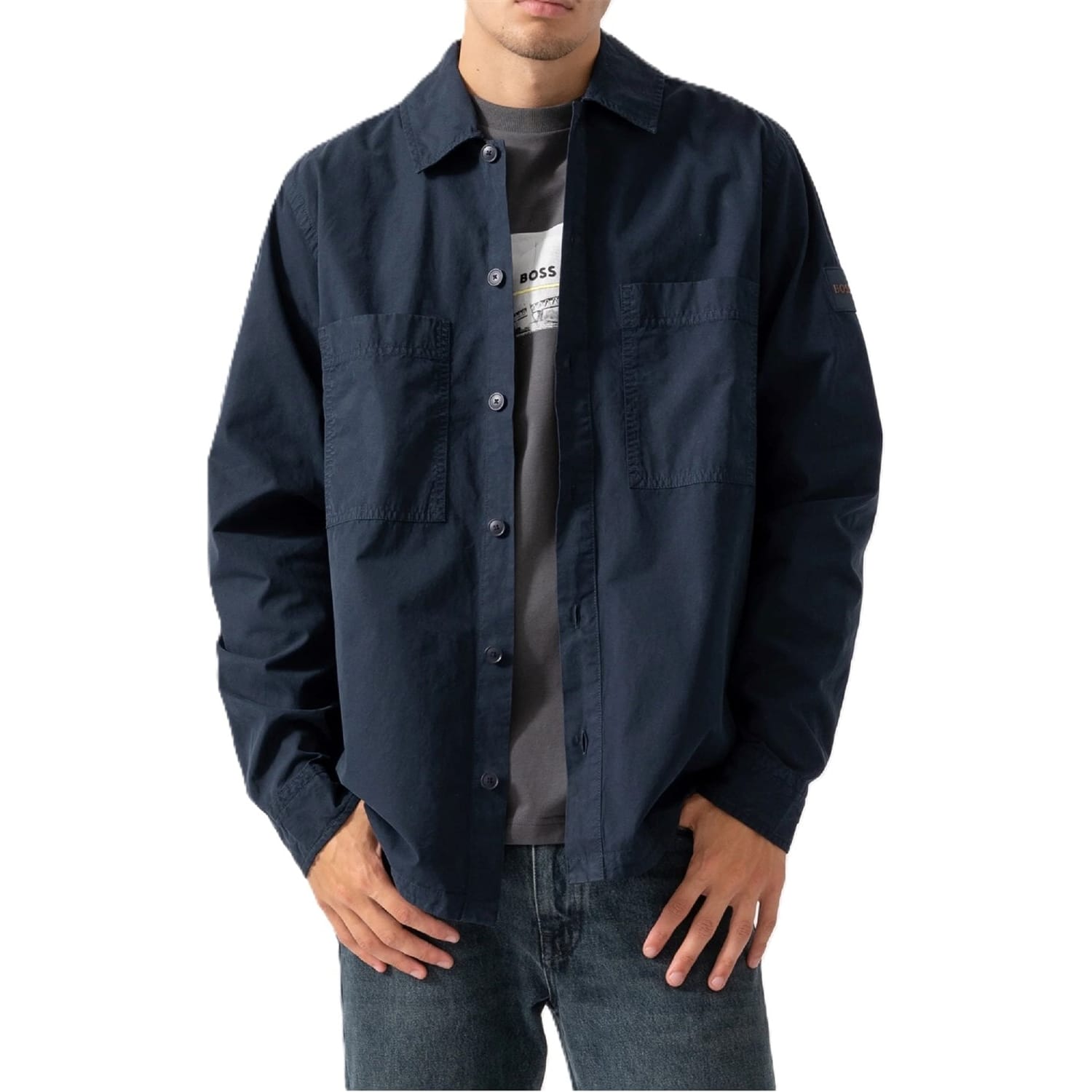 This Boss shirt jacket features a solid pattern and a regular fit, offering a classic look. It is designed with a shirt collar and a straight hem, providing a structured silhouette. The jacket includes a button closure and practical pockets, making it both stylish and functional. Its short length adds a modern touch to this versatile piece. -