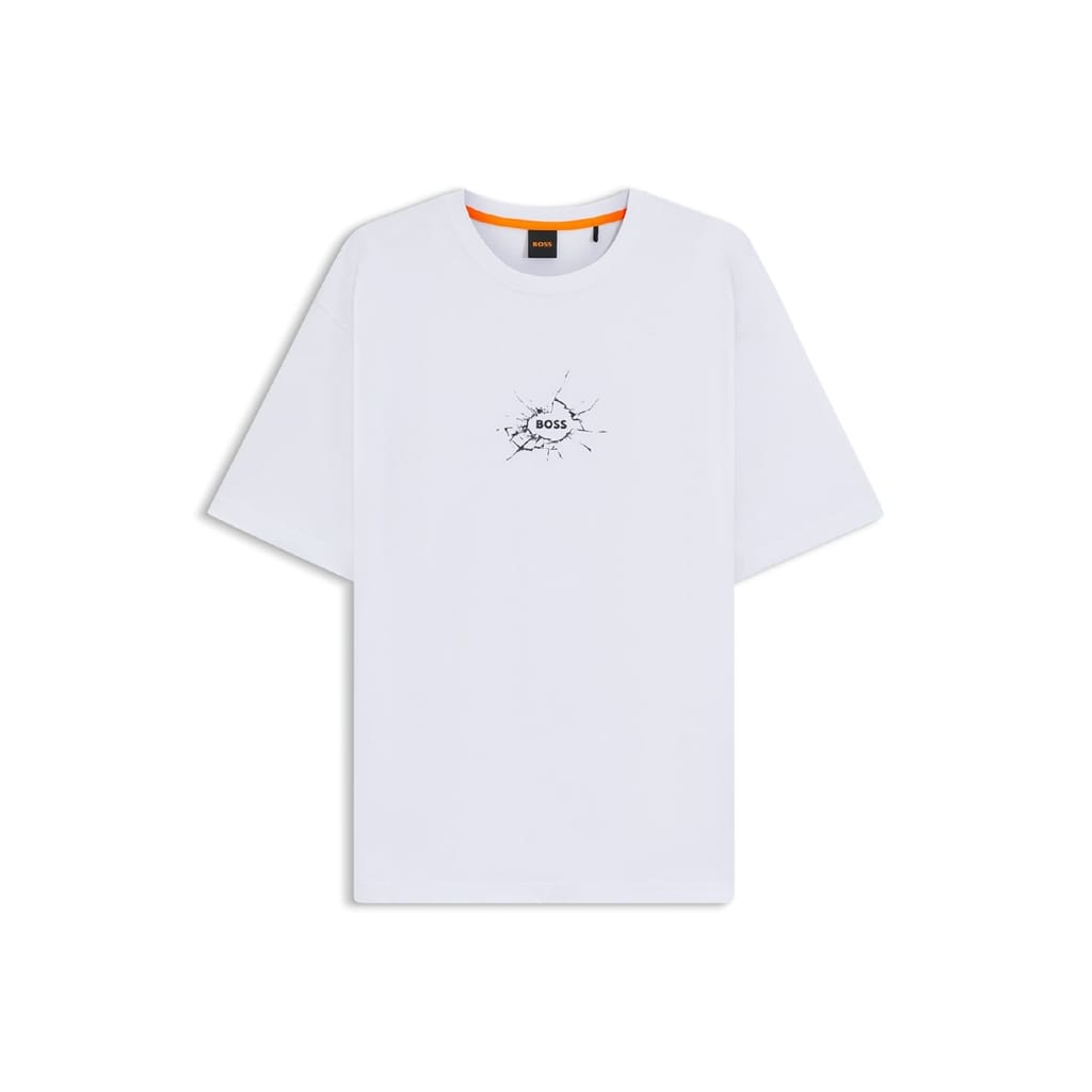 This Boss top from the Voyage collection features a crew neck and short sleeves with a drop shoulder design. It offers a regular fit and a straight hem. The top is adorned with a graphic print and a logo embellishment, adding a stylish touch to your wardrobe. -