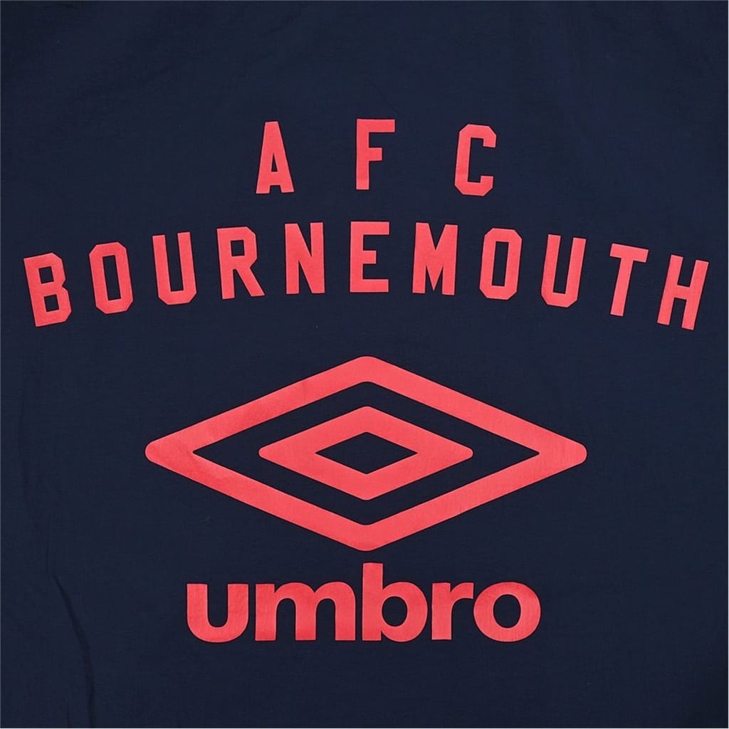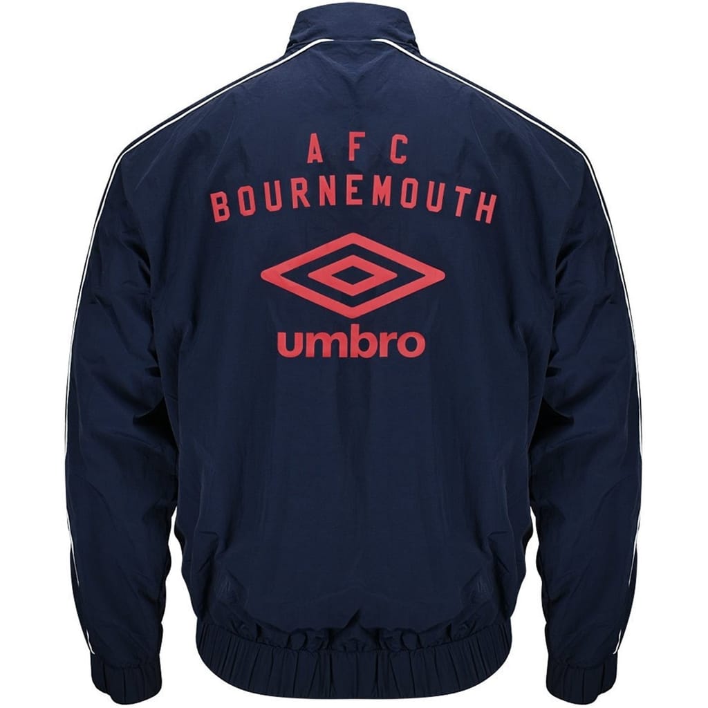 This Bournemouth AFC track jacket is designed for sporting activity, featuring a water-repellent finish. It has a band collar and a zipper closure, ensuring practicality. The jacket includes an elasticated hem and cuffs for a comfortable fit. Embellished with a crest logo and front logo, it showcases a logo print pattern, making it a stylish choice for fans. -
