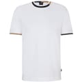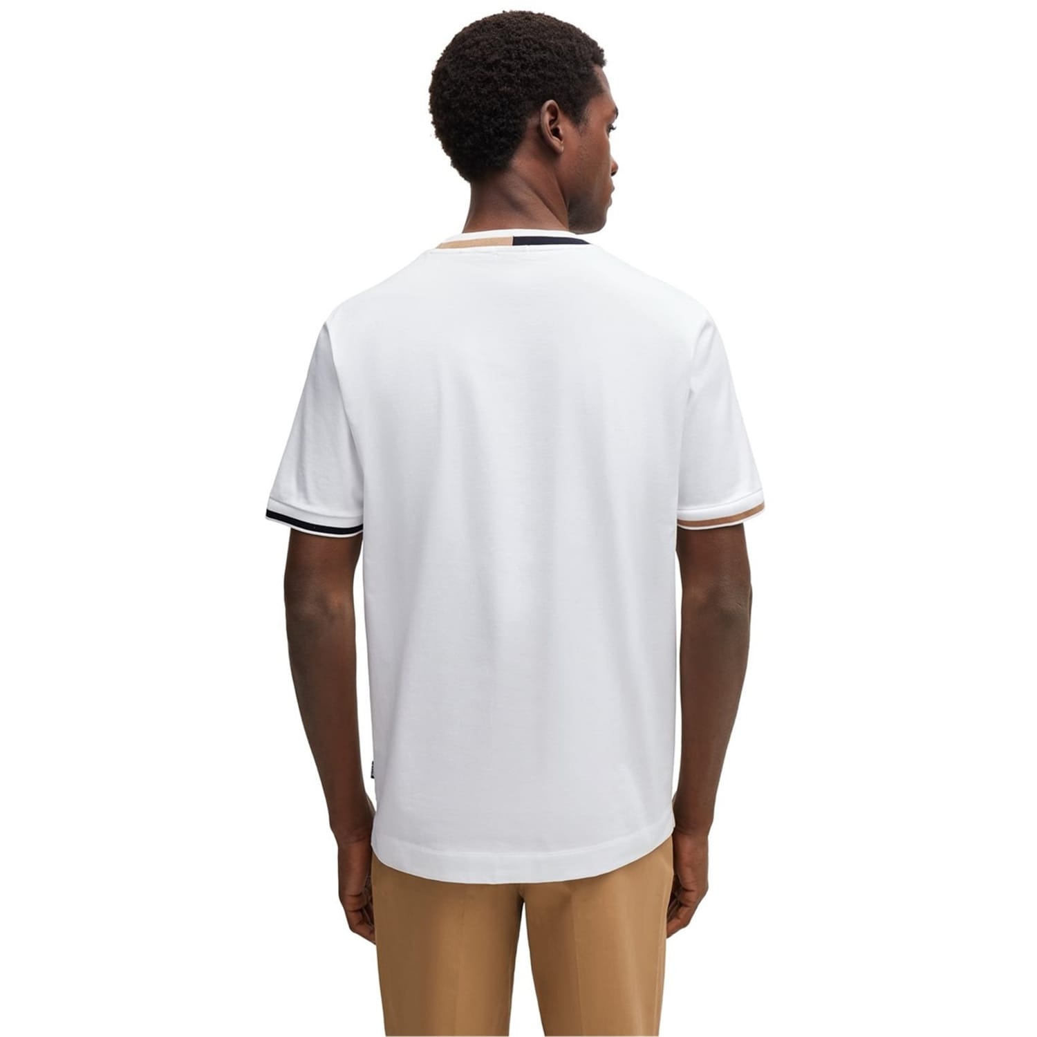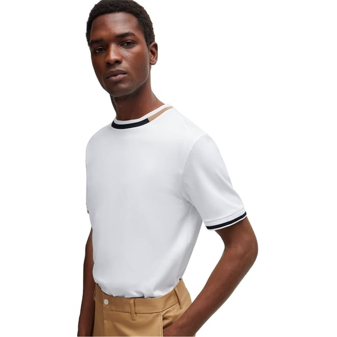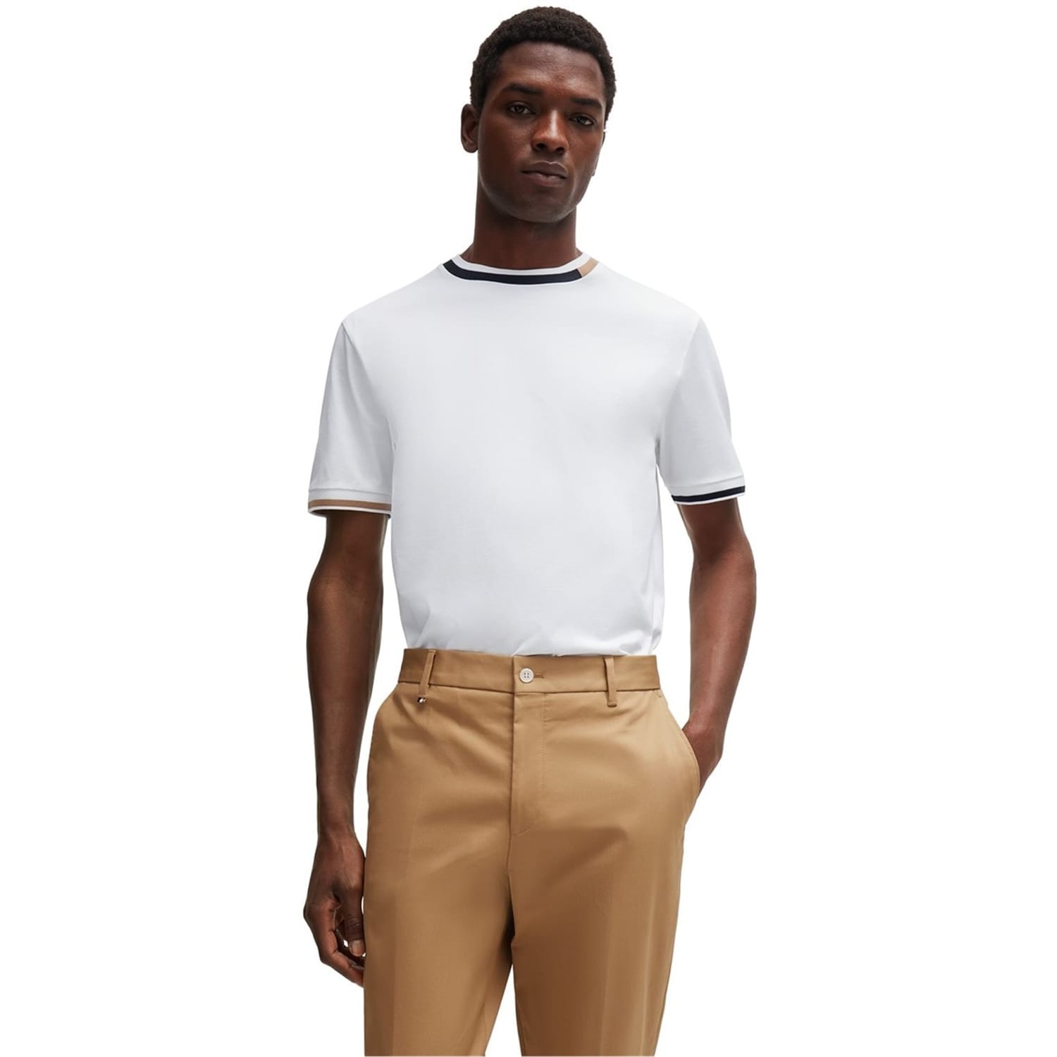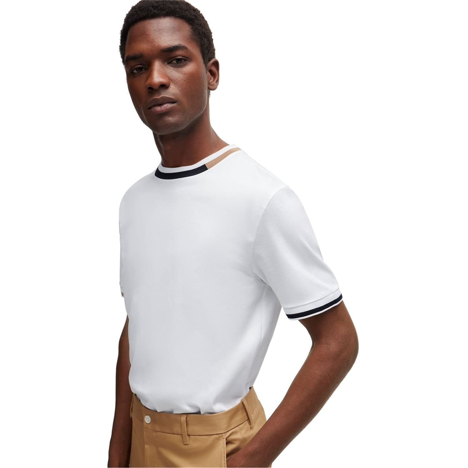 This Boss top features a classic crew neck and short sleeves, offering a regular fit. The solid pattern and ribbed collar add a touch of sophistication, while the straight hem ensures a clean finish. Ideal for a versatile wardrobe staple. -
