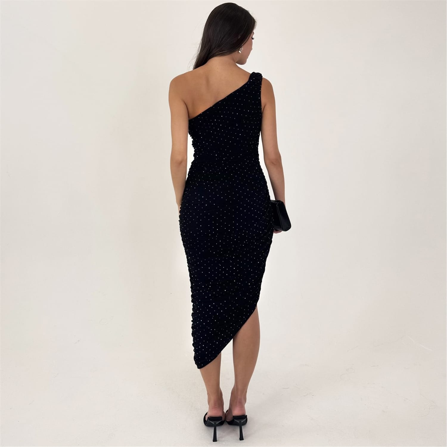 Make an unforgettable entrance in our Black Diamante Sparkle One Shoulder Ruched Midi Dress. Crafted from our stunning sparkly stretch fabric with diamante studs, it features a curve-enhancing silhouette, full lining, a one shoulder top, ruched detailing along the body and an asymmetric hem. Team it with strappy heels and a clutch for a glam party season look.
