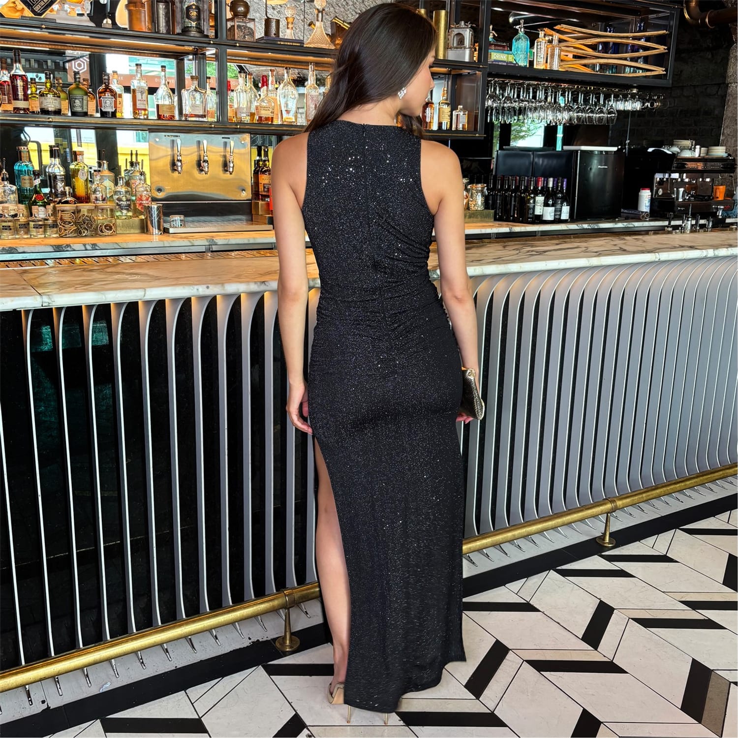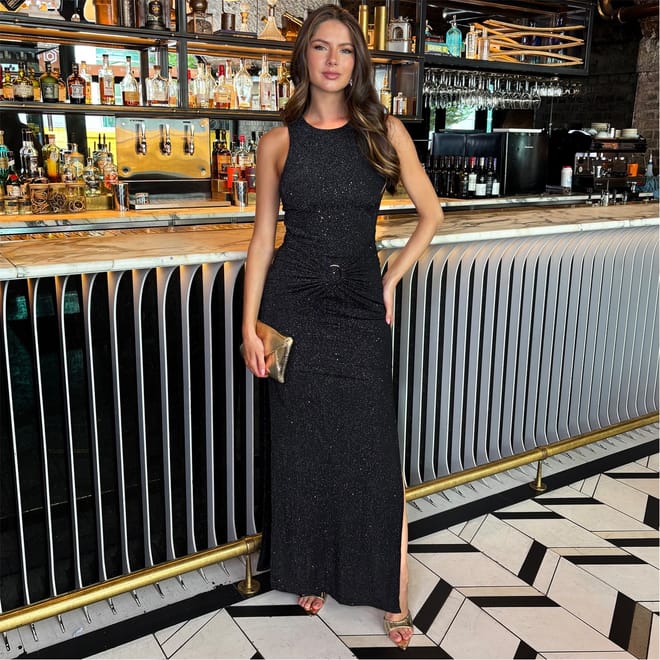 Get ready to be the talk of the evening in our Black Sparkle O-Ring Detail Bodycon Midi Dress. Featuring our gorgeous sparkly stretch fabric, mini length lining, a curve enhancing silhouette, a sleeveless top with a round neckline, a zip-up back, ruched hips with a front O ring detail, and a midi skirt with a double leg split. Pair it with heels and your favourite jewelry to create a sophisticated festive event look.