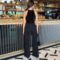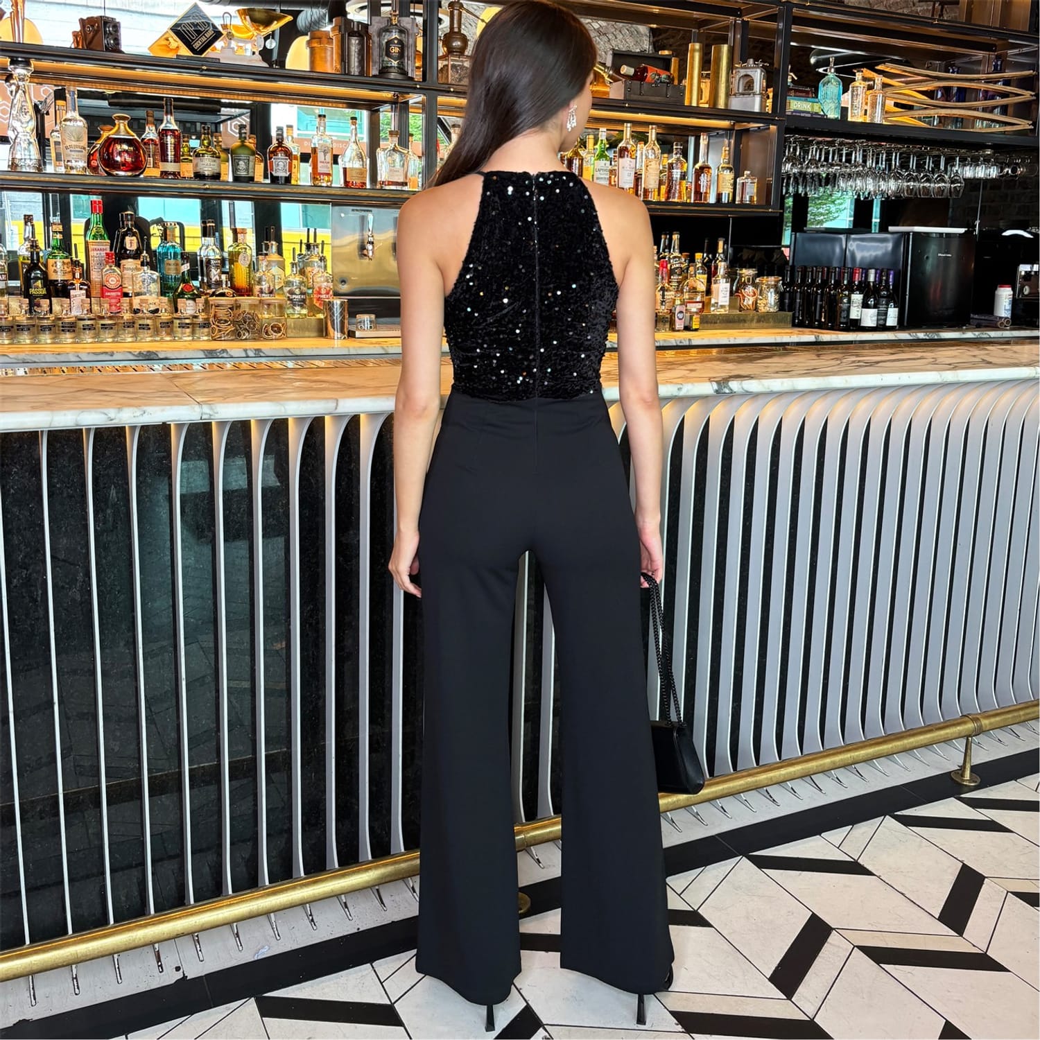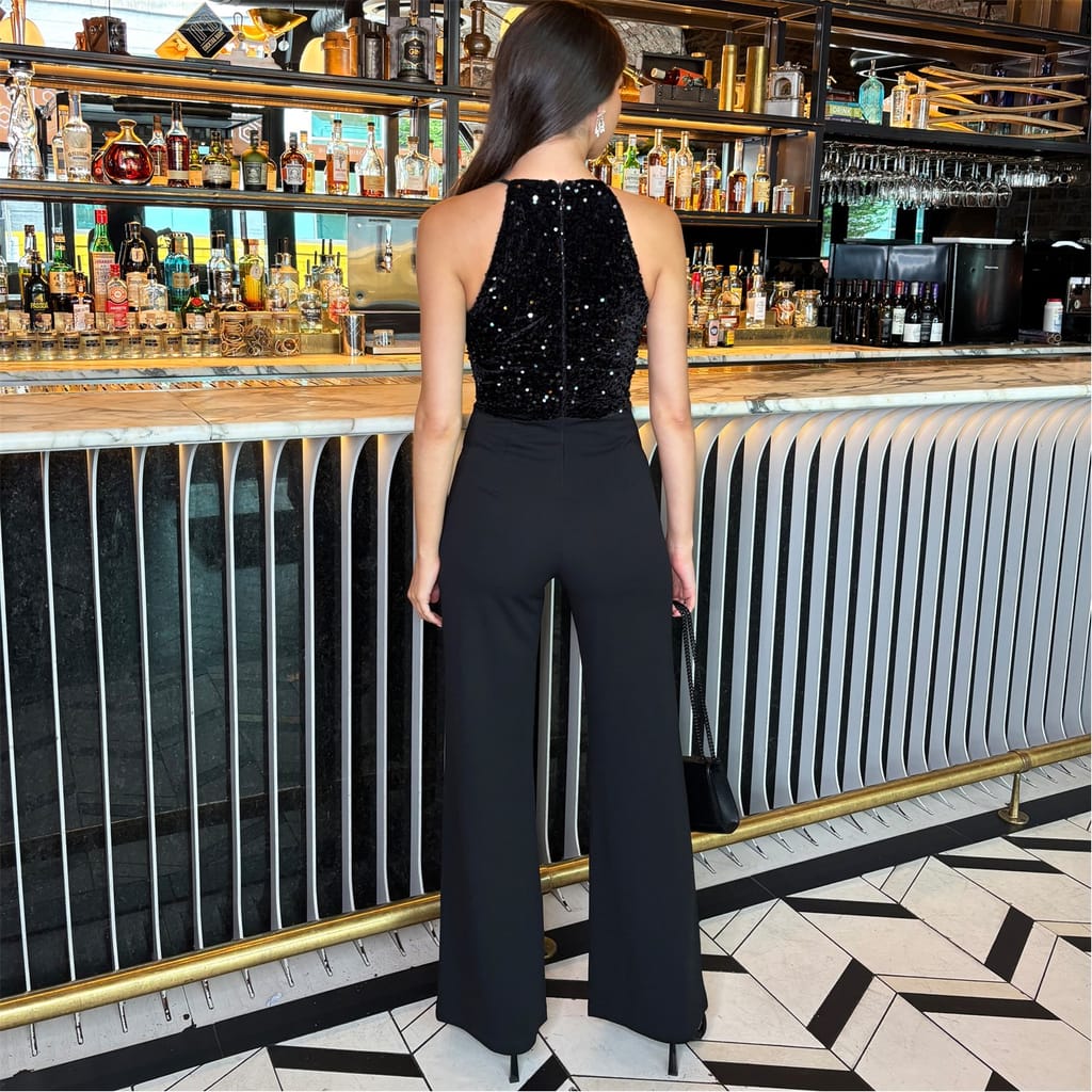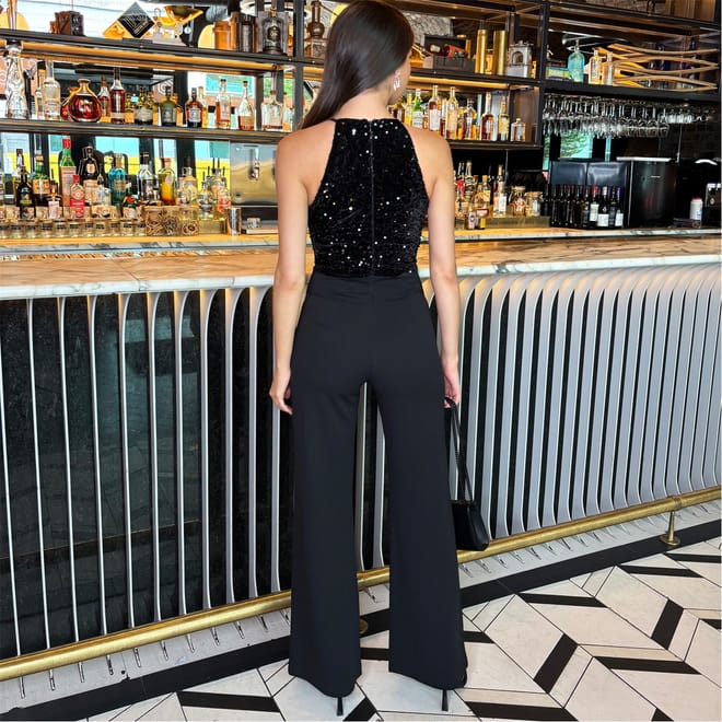 Our Black Velvet Sequin 2 in 1 Racer Neck Jumpsuit is the perfect alternative to a dress for the festive season. Featuring a velvet and sequin top, a racer neckline, a zip-up back and wide leg full length trousers. Pair it with heels and our matching sequin jacket for the perfect Christmas party look!