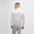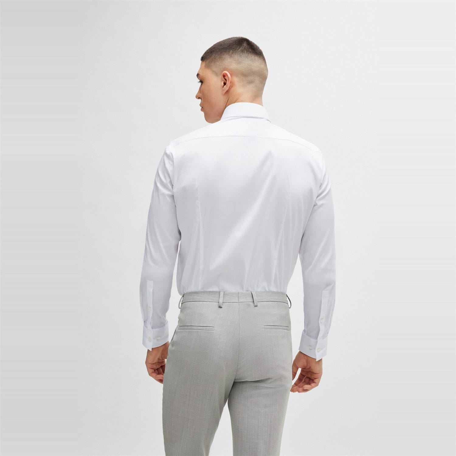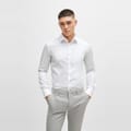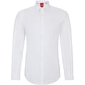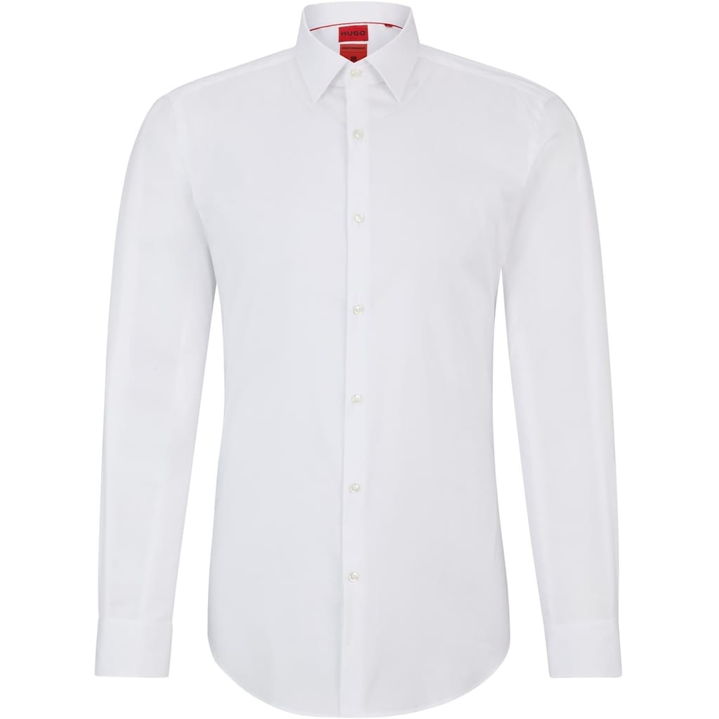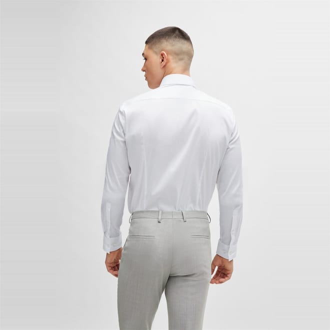 This Boss top is a formal piece featuring a solid pattern and a slim fit. It has long shirt sleeves with a barrel cuff and a shirt collar. The top is designed with a full button closure and a curved hem, making it a sophisticated choice for any formal occasion. -