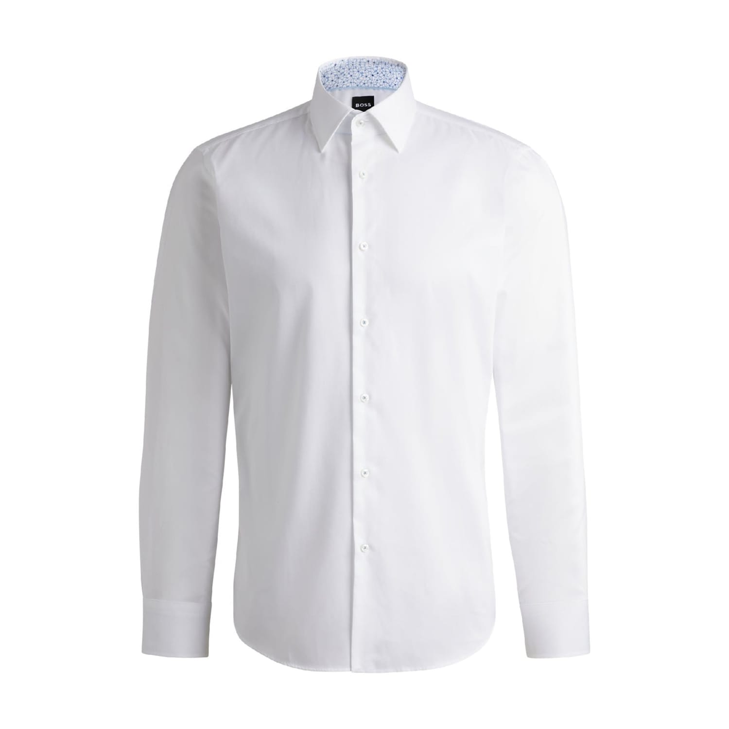 The Boss Joe top is a formal piece featuring a solid pattern and a regular fit. It has long sleeves with a shirt sleeve style and a barrel cuff. The shirt collar complements the front button closure, while the straight hemline adds a neat finish. Ideal for a polished look, this top embodies classic elegance. -
