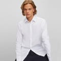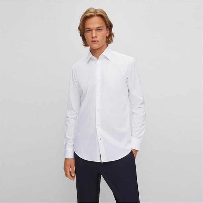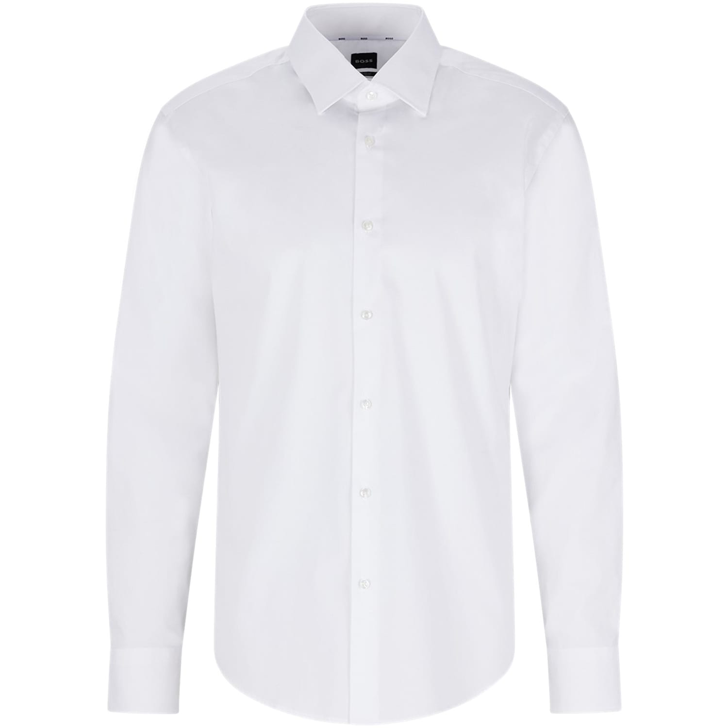 The Boss Joe top is a formal piece featuring a solid pattern and a regular fit. It comes with long shirt sleeves and a full button closure, complemented by a classic shirt collar and barrel cuffs. The design is completed with a curved hem, making it a versatile addition to any wardrobe. -