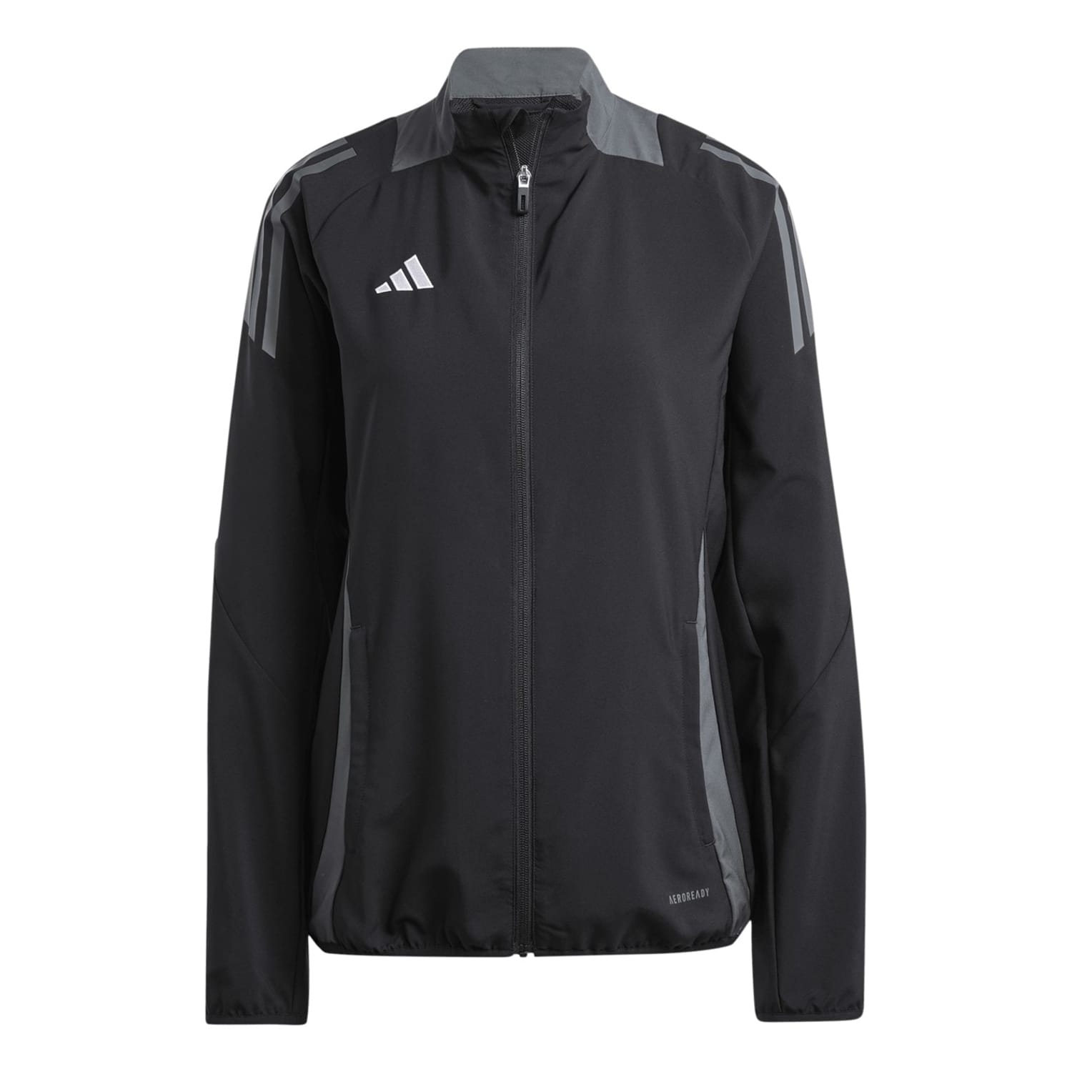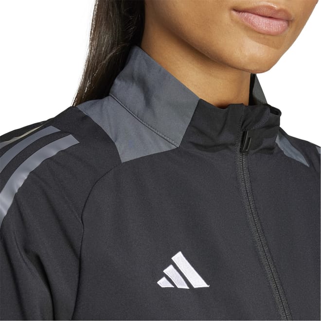 This adidas top features a funnel neck and long raglan sleeves, offering a regular fit. The high collar and elasticated cuffs provide comfort, while the zipper closure ensures ease of wear. Embellished with the iconic logo, side stripes, and pockets, it showcases the signature three stripes pattern. The elasticated hem adds a touch of practicality to this stylish piece. -