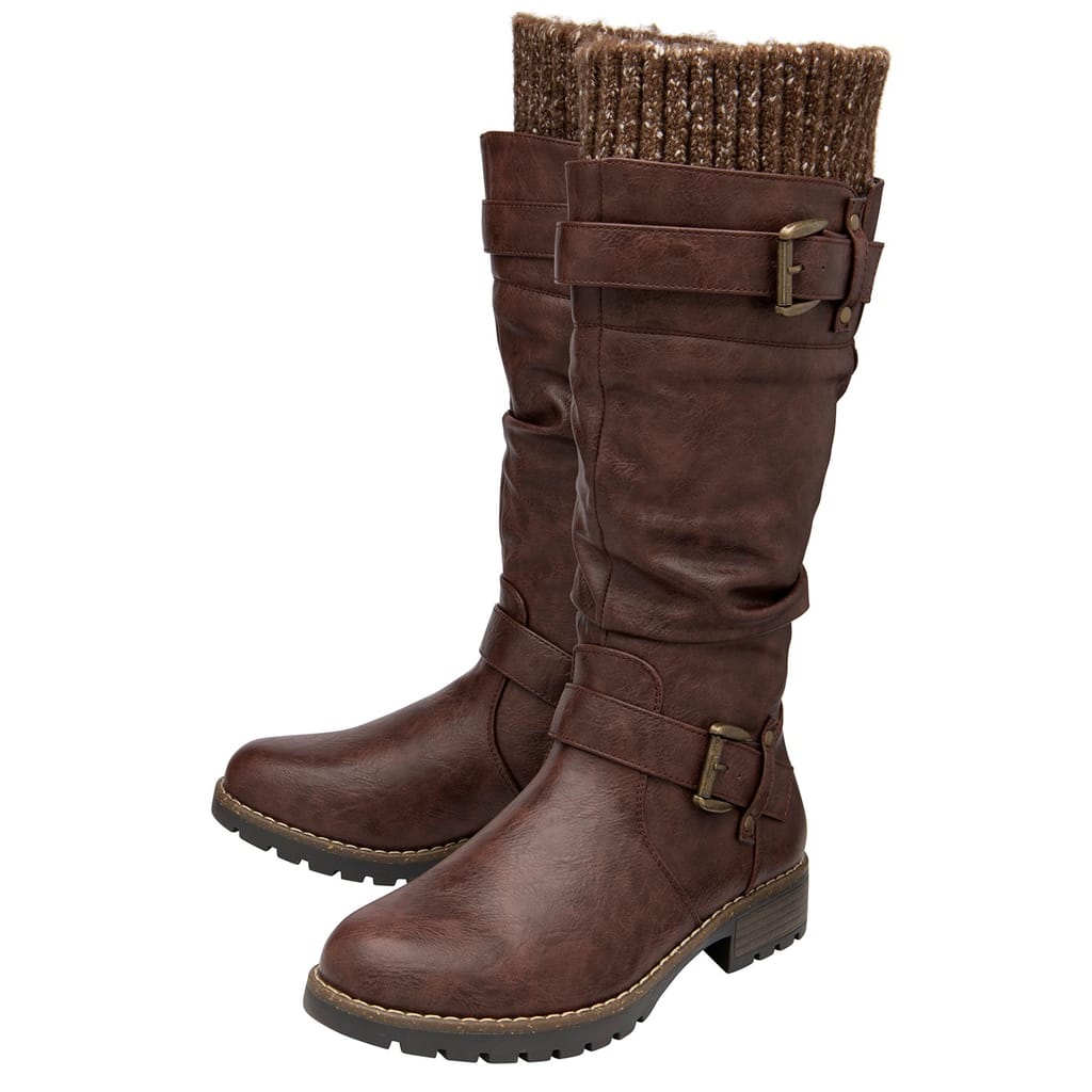 Add some style to your autumn/winter wardrobe with the Juniper casual knee high boot from Lotus. Enhancing the slouchy leg of this faux leather style is buckle detailing and a knitted fabric top collar. This Lotus boot is exceptionally wearable due to the 3.5cm heel and the functional inside zip. -