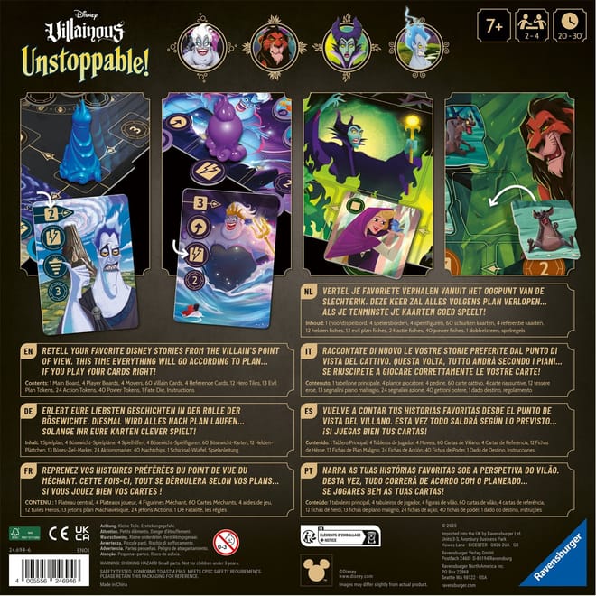 Step into the shoes of 4 famous Disney Villains: Maleficent, Ursula, Hades and Scar, and follow your own goal to become the worst villain of all time! To achieve this, make clever use of your special abilities and try to ruin your opponents' plans. Play as one of Disney's most famous villains! Fun to play and simple rules.