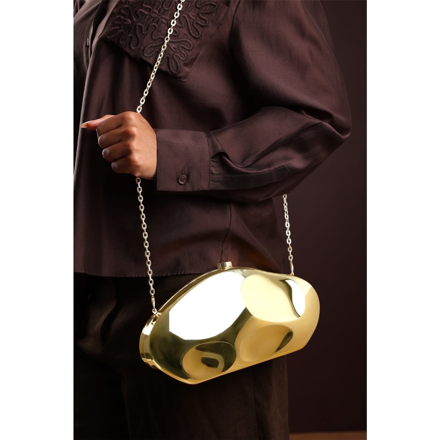 The Sculpted Evening Clutch Bag is a striking statement piece designed to elevate any outfit. With its bold sculpted silhouette and high-shine metallic finish, this clutch brings modern glamour to special occasions. -