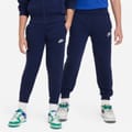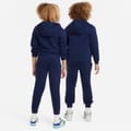 This Nike Fleece Tracksuit consists of a hoodie and joggers. The hoodie is crafted with zip fastening, long sleeves, a hood and 2 pockets. The joggers feature an elasticated waist, drawstring fastening, ribbed cuffs and 2 pockets. Both pieces in this set are designed with a signature logo and are complete with Nike Swoosh branding. -