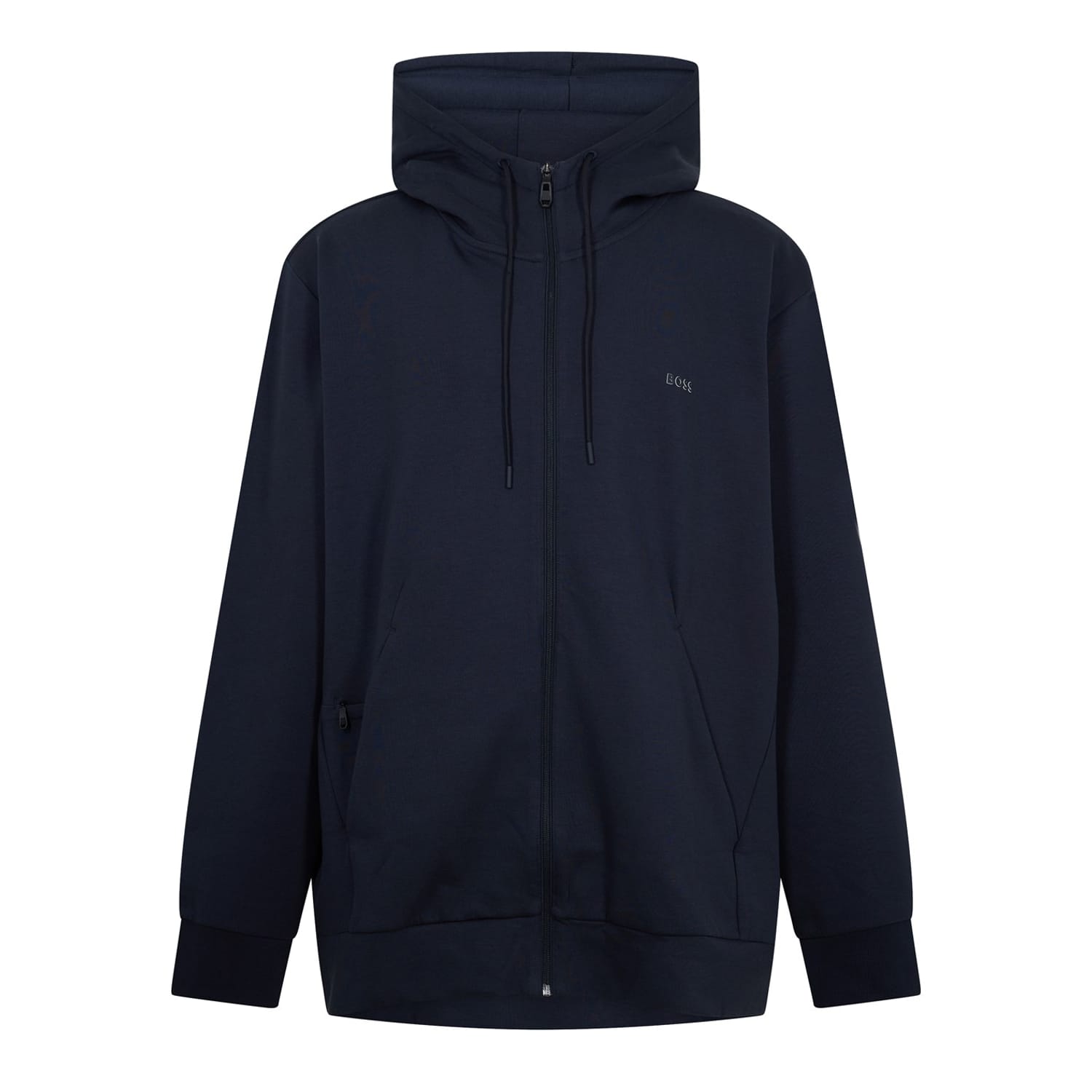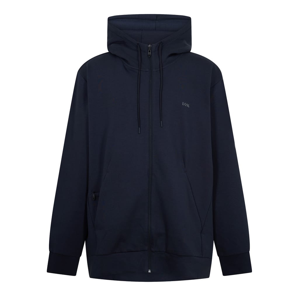 This Boss top from the outerwear collection features a hooded neck and long sleeves. It has a regular fit with a straight hem and ribbed cuffs. The solid pattern is complemented by a front zipper closure and a chest logo. Practicality is enhanced with a front zipper pocket, making it a versatile addition to your wardrobe. -