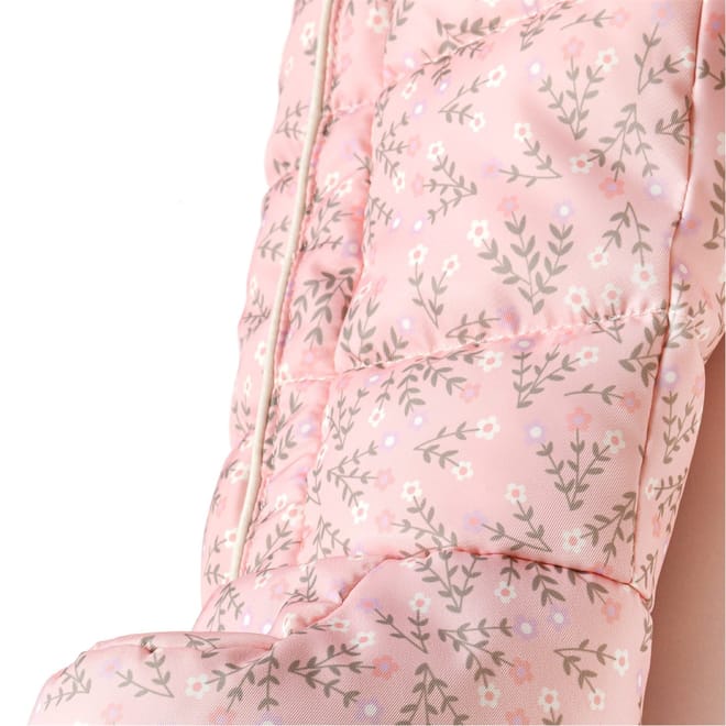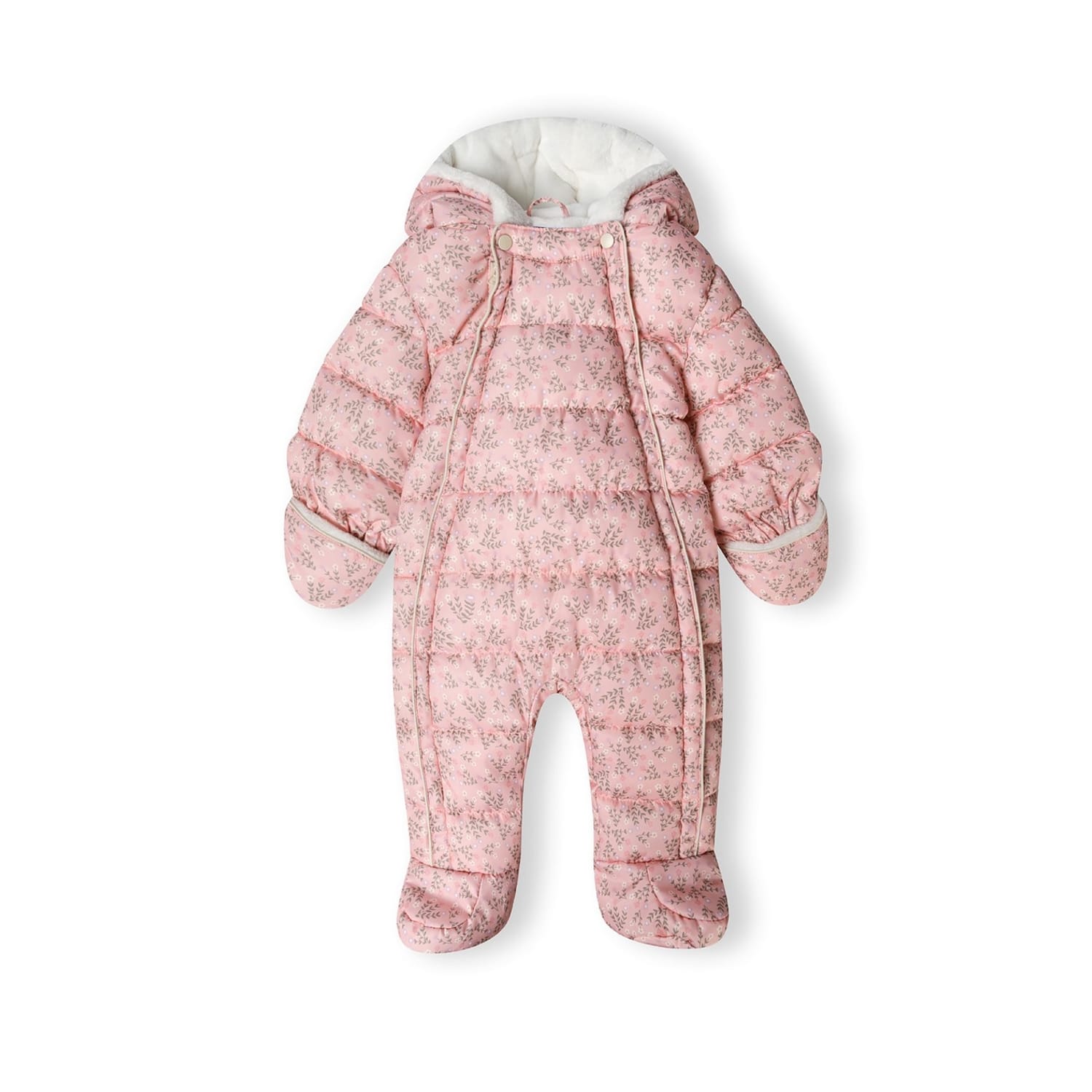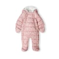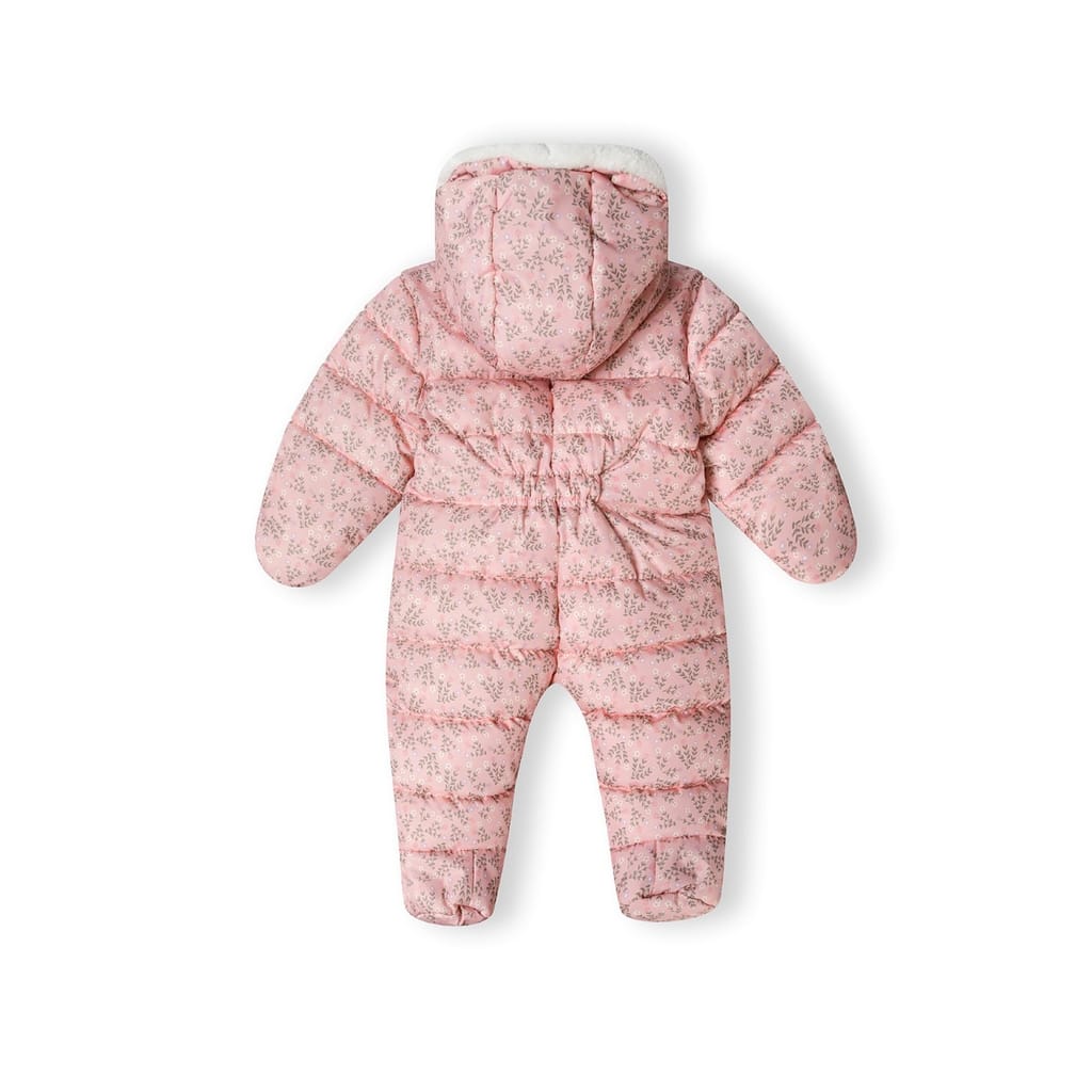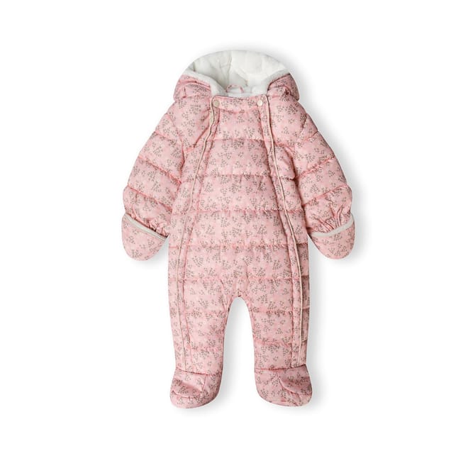 In sizes 12-18mths (80-86cm), and 18-24mths(86-92cm), the legs are without foot and are finished with an elasticated hem. The girls baby snowsuit provides full coverage to maintain warmth in cold weather. Constructed from a soft-touch fabric in a light pink shade, it features a delicate, subtle all-over pattern. Tailored for babies, the relaxed fit ensures ease of movement, while the fixed hood is fully lined to enhance warmth. Equipped with a double full-length zipper, the snowsuit allows quick dressing and undressing, facilitating diaper changes. The cuffs fold back to cover hands and offer additional cold protection. Light padding provides insulation without excessive bulk, and the interior is fully lined for a soft touch against the skin. Practical features and a soothing colour combine to offer an adaptable winter garment for colder conditions.
