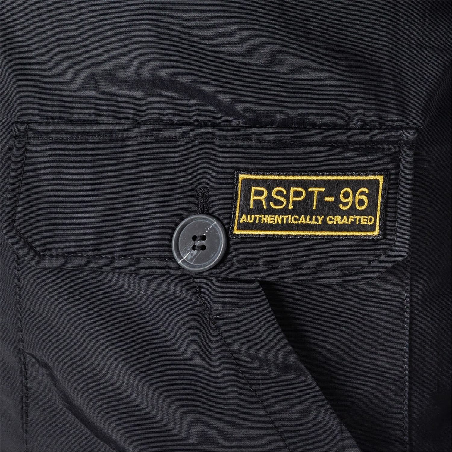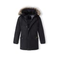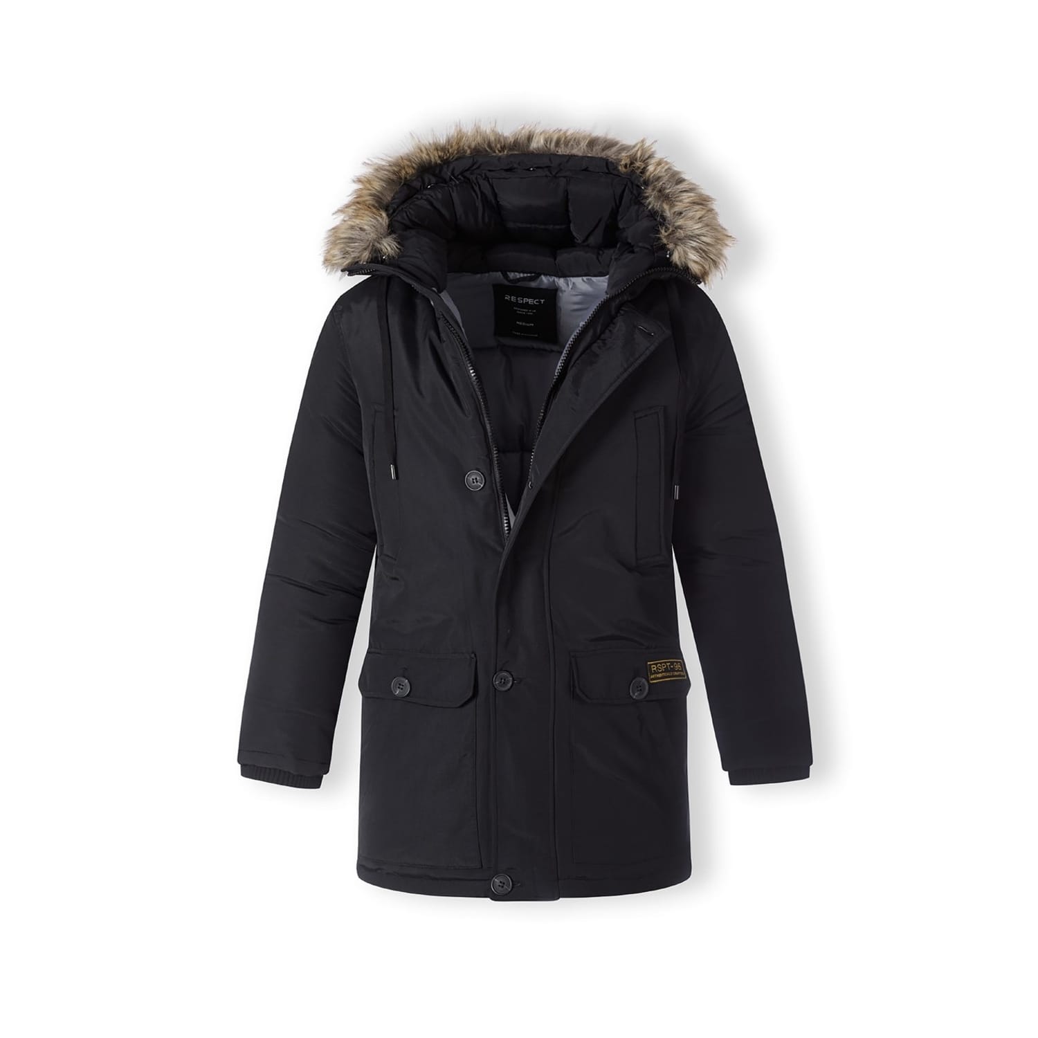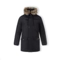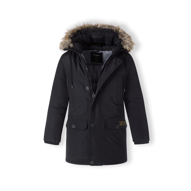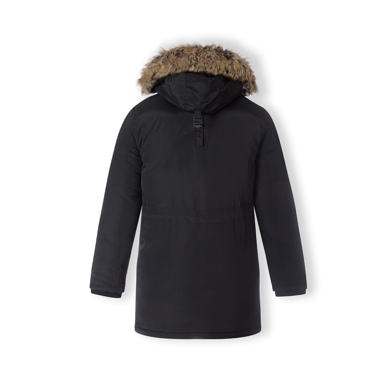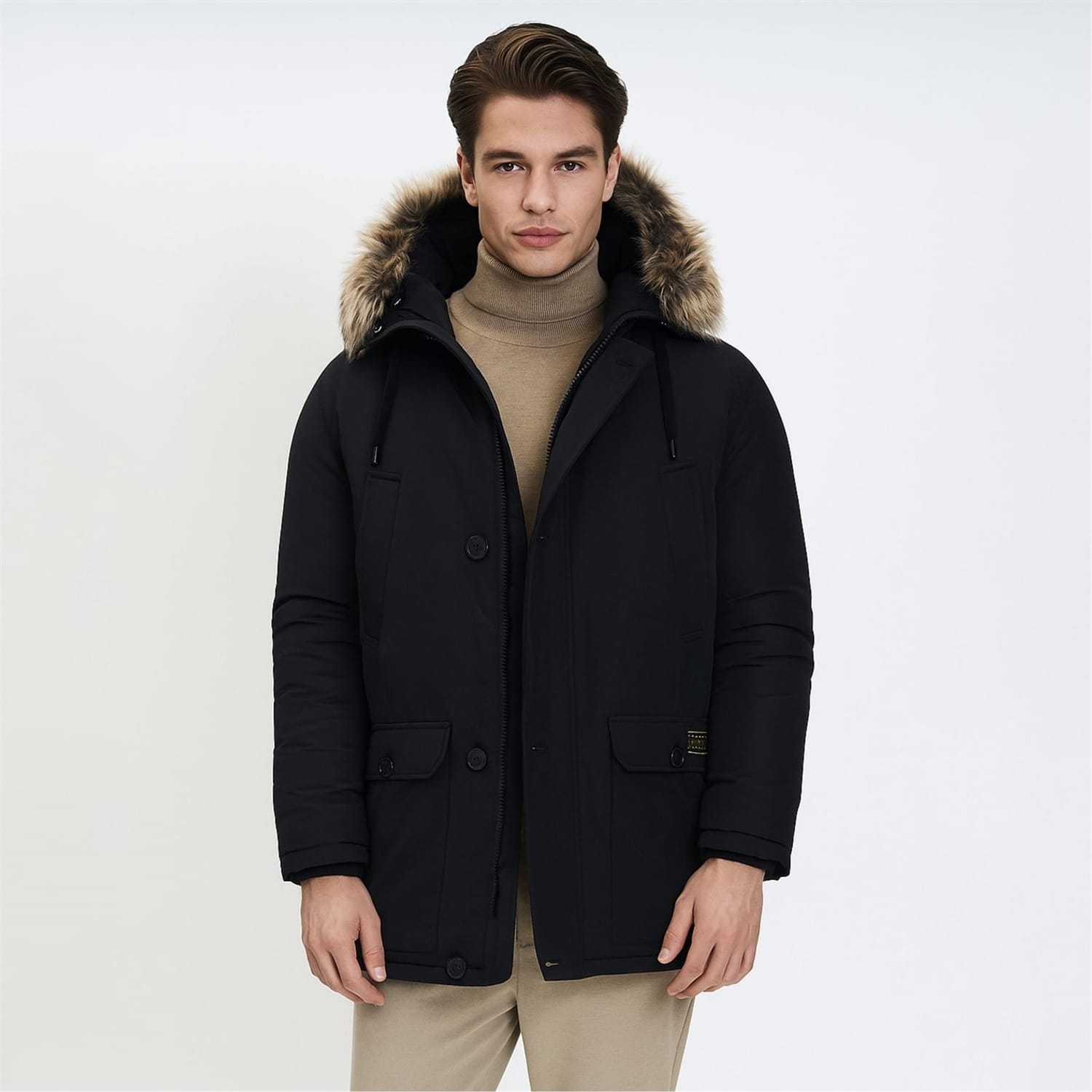 Men's padded parka jacket crafted for effective warmth and protection during cold weather conditions. The exterior is black and quilted with padding that helps retain heat, making it suitable for winter months. The hood is edged with a faux fur trim to improve insulation and add a subtle, polished detail to the jacket's design. Interior contrast lining provides both visual appeal and added comfort. Tailored for a fit that allows freedom of movement and practical daily wear. The parka includes multiple external pockets for storage convenience and a discreet badge detail that enhances the contemporary, urban style of the garment.
