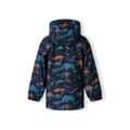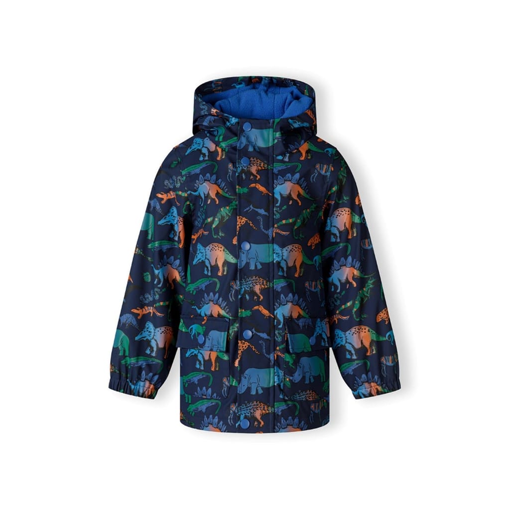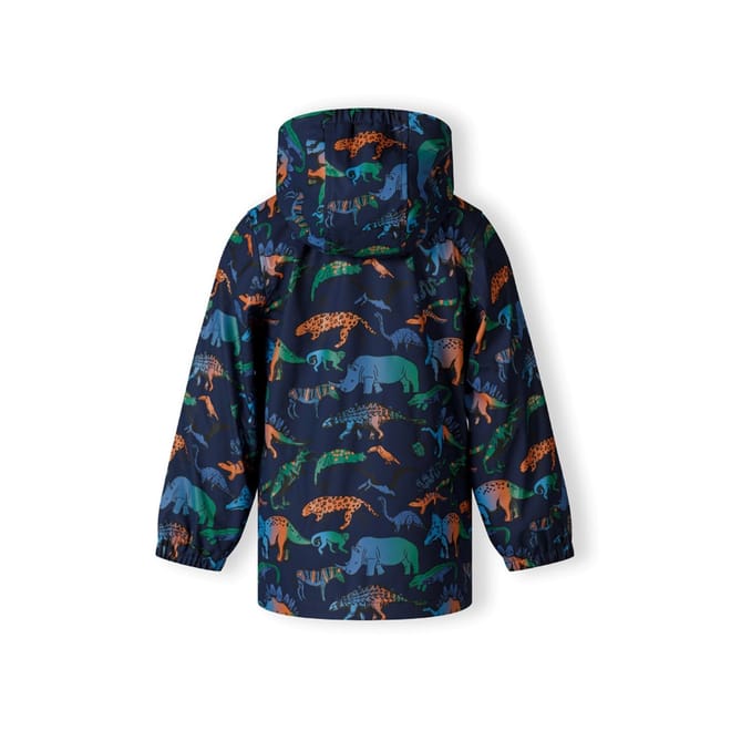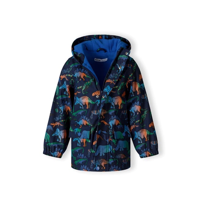 The boys rain jacket offers dependable protection against rain and wet weather conditions. It has a navy blue base with an all-over printed pattern, designed specifically for boys within the height range of 92-164 cm. The jacket is made from a lightweight fabric, which supports ease of movement and comfort during outdoor activities. Key details include a front zip closure and an attached hood to provide protection from rain and wind. The ribbed cuffs secure the fit at the wrists and help prevent water ingress. Two front pockets provide practical storage for small items. The fabric is simple to wash and maintain, ensuring durability and suitability for everyday wear.