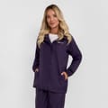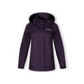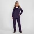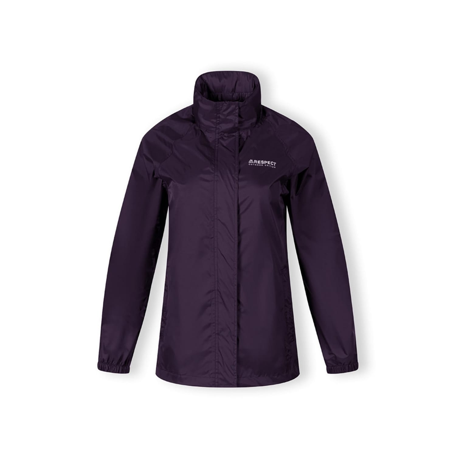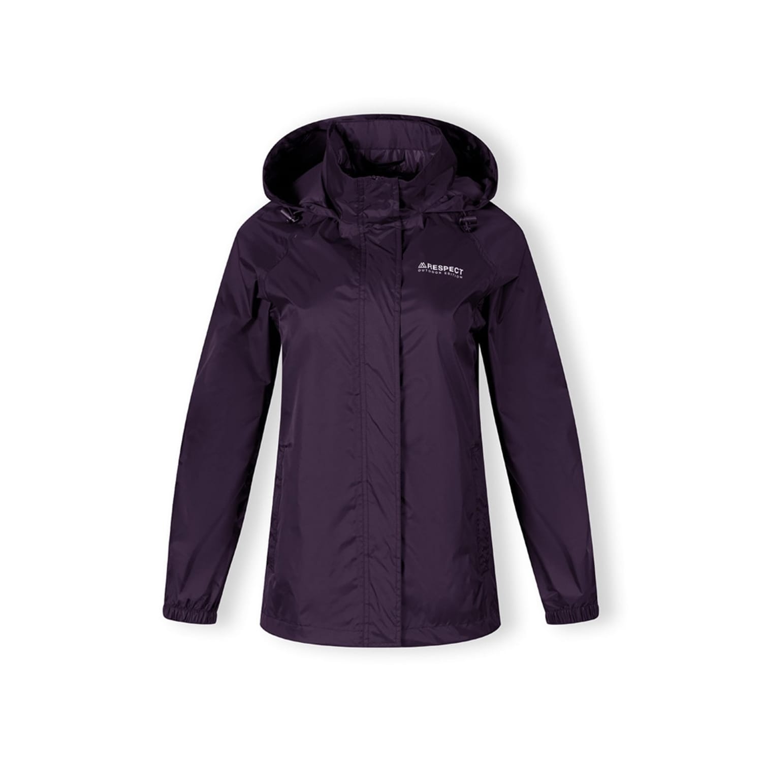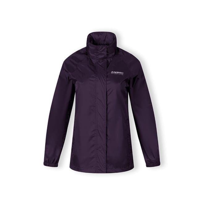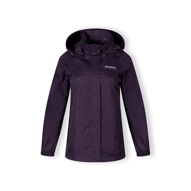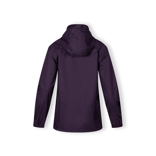 The product is a packaway waterproof jacket designed for women, providing essential protection against wet weather conditions. The jacket is predominantly purple and features a subtle print on the chest and sleeve. It includes a hood that can be conveniently folded into the collar for adaptable coverage. The front fastening is a zip concealed by an overlapping pleat to enhance water resistance. Functional zipped pockets are located on the front for secure storage. Elasticated cuffs help maintain a snug fit around the wrists, minimising water ingress. The jacket is lightweight and designed to fold compactly into its own pouch for portability and ease of storage.