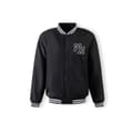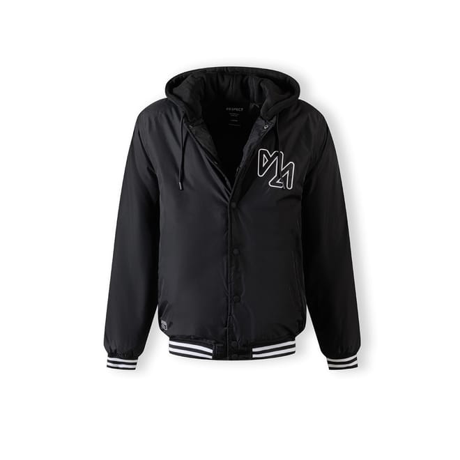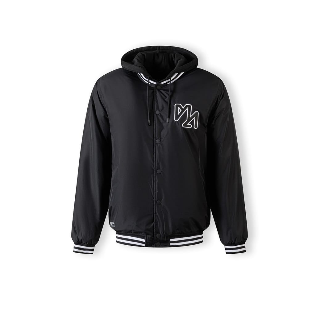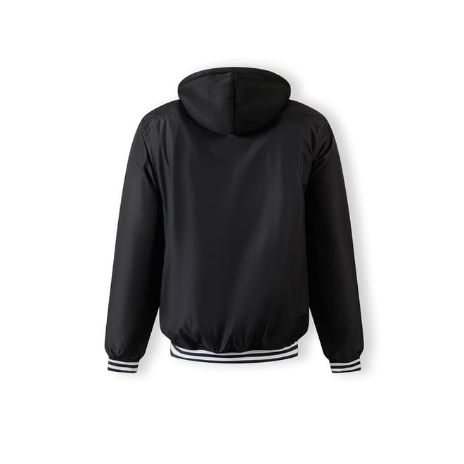 Men's baseball style jacket designed for transitional weather wear, offering adaptable layering options. The jacket is presented in black with classic varsity features including ribbed cuffs, waistband, and hood lining, each highlighted with contrasting stripes. It includes a detachable hood made from sweatshirt knit fabric, fastened with buttons and equipped with an adjustable drawstring for personalised fit adjustment. The chest displays embroidered detailing for subtle decoration. The garment incorporates a combination of zip and snap closures on the pockets to enhance practical use. The construction reflects traditional baseball jacket aesthetics combined with functional outerwear elements suitable for fluctuating seasonal conditions and layering.